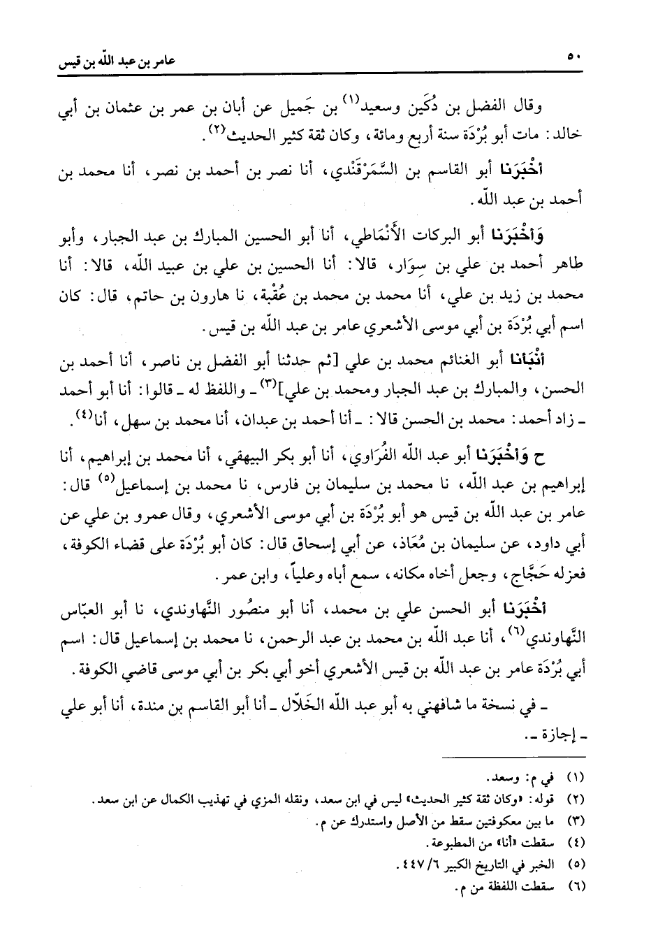 وقال الفضل بن دكين وسعيد (1) بن جميل عن أبان بن عمر بن عثمان بن أبي خالد مات أبو بردة سنة أربع ومائة وكان ثقة كثير الحديث (2) أخبرنا أبو القاسم بن السمرقندي أنا نصر بن أحمد بن نصر أنا محمد بن أحمد بن عبد الله أخبرنا أبو البركات الأنماكي أنا أبو الحسين المبارك بن عبد الجبار وأبو طاهر أحمد بن علي بن سوار قالا أنا الحسين بن علي بن عبيد الله قالا أنا محمد بن زيد بن علي أنا محمد بن محمد بن عقبة نا هارون بن حاتم قال كان اسم أبي بردة بن أبي موسى الأشعري عامر بن عبد الله بن قيس أنبأنا أبو الغنائم محمد بن علي ثم حدثنا أبو الفضل بن ناصر أنا أحمد بن الحسن والمبارك بن عبد الجبار ومحمد بن علي (3) واللفظ له قالوا أنا أبو أحمد زاد أحمد محمد بن الحسن قالا أنا أحمد بن عبدان أنا محمد بن سهل أنا (4) ح وأخبرنا أبو عبد الله الفراوي أنا أبو بكر البيهقي أنا محمد بن إبراهيم أنا إبراهيم بن عبد الله نا محمد بن سليمان بن فارس نا محمد بن إسماعيل (5) قال عامر بن عبد الله بن قيس هو أبو بردة بن أبي موسى الأشعري وقال عمرو بن علي عبد أبي داود عن سليمان بن معاذ عن أبي إسحاق قال كان أبو بردة على قضاء الكوفة فعزله حجاج وجعل أخاه مكانه سمع أباه وعليا وابن عمر أخبرنا أبو الحسن علي بن محمد أنا أبو منصور النهاوندي نا أبو العباس النهاوندي (6) أنا عبد الله بن محمد بن عبد الرحمن نا محمد بن إسماعيل قال اسم أبي بردة عامر بن عبد الله بن قيس الأشعري أخو أبي بكر بن أبي موسى قاضي الكوفة في نسخة ما شافهني به أبو عبد الله الخلال أنا أبو القاسم بن مندة أنا أبو علي إجازة