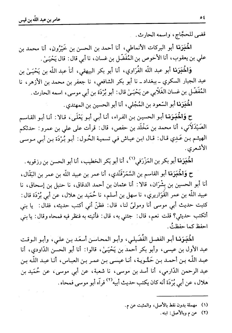 قضى للحجاج واسمه الحارث أخبرنا أبو البركات الأنماطي أنا أحمد بن الحسن بن خيرون أنا محمد بن علي بن يعقوب أنا الأحوص بن المفضل بن غسان نا أبي قال قال يحيى وأخبرنا أبو عبد الله الفراوي أنا أبو بكر البيهقي أنا عبد الله بن يحيى بن عبد الجبار السكري ببغداد نا أبو بكر الشافعي نا جعفر بن محمد بن الأزهر نا المفضل بن غسان الغلابي عن يحيى قال أبو بردة بن أبي موسى اسمه الحارث أخبرنا أبو السعود بن المجلي أنا أبو الحسين بن المهتدي ح وأخبرنا أبو الحسين بن الفراء أنا أبي أبو يعلى قالا أنا أبو القاسم الصيدلاني أنا محمد بن مخلد بن حفص قال قرأت على علي بن عمرو حدثكم الهيثم بن عدي قال قال ابن عياش في تسمية الحول أبو بردة بن أبي موسى الأشعري أخبرنا أبو بكر بن المزرفي (1) أنا أبو بكر الخطيب أنا أبو الحسن بن رزقويه ح أخبرنا أبو القاسم بن السمرقندي أنا عمر بن عبيد الله بن عمر بن البقال أنا أبو الحسين بن بشران قالا أنا عثمان بن أحمد الدقاق نا حنبل بن إسحاق نا عبيد الله بن عمر القواريري نا سهل بن أسلم نا حميد بن هلال عن أبي بردة قال كتبت حديث أبي موسى أنا ومولى لنا قال فظن أني أكتب حديثه فقال يا بني أتكتب حديثي قلت نعم قال جئني به قال فأتيته به فنظر فيه فمحاه وقال يا بني احفظ كما حفظت أخبرنا أبو الفضل الفضيلي وأبو المحاسن أسعد بن علي وأبو الوقت عبد الأول بن عيسى وأبو بكر أحمد بن يحيى قالوا أنا أبو الحسن الداودي أنا عبد الله بن أحمد بن حموية أنا عيسى بن عمر بن العباس أنا عبد الله بن عبد الرحمن الدارمي أنا أسد بن موسى نا شعبة عن أبي موسى نا شعبة عن أبي موسى عن حميد بن هلال عن أبي بردة أنه كان يكتب حديث أبيه (2) فرآه أبو موسى فمحاه