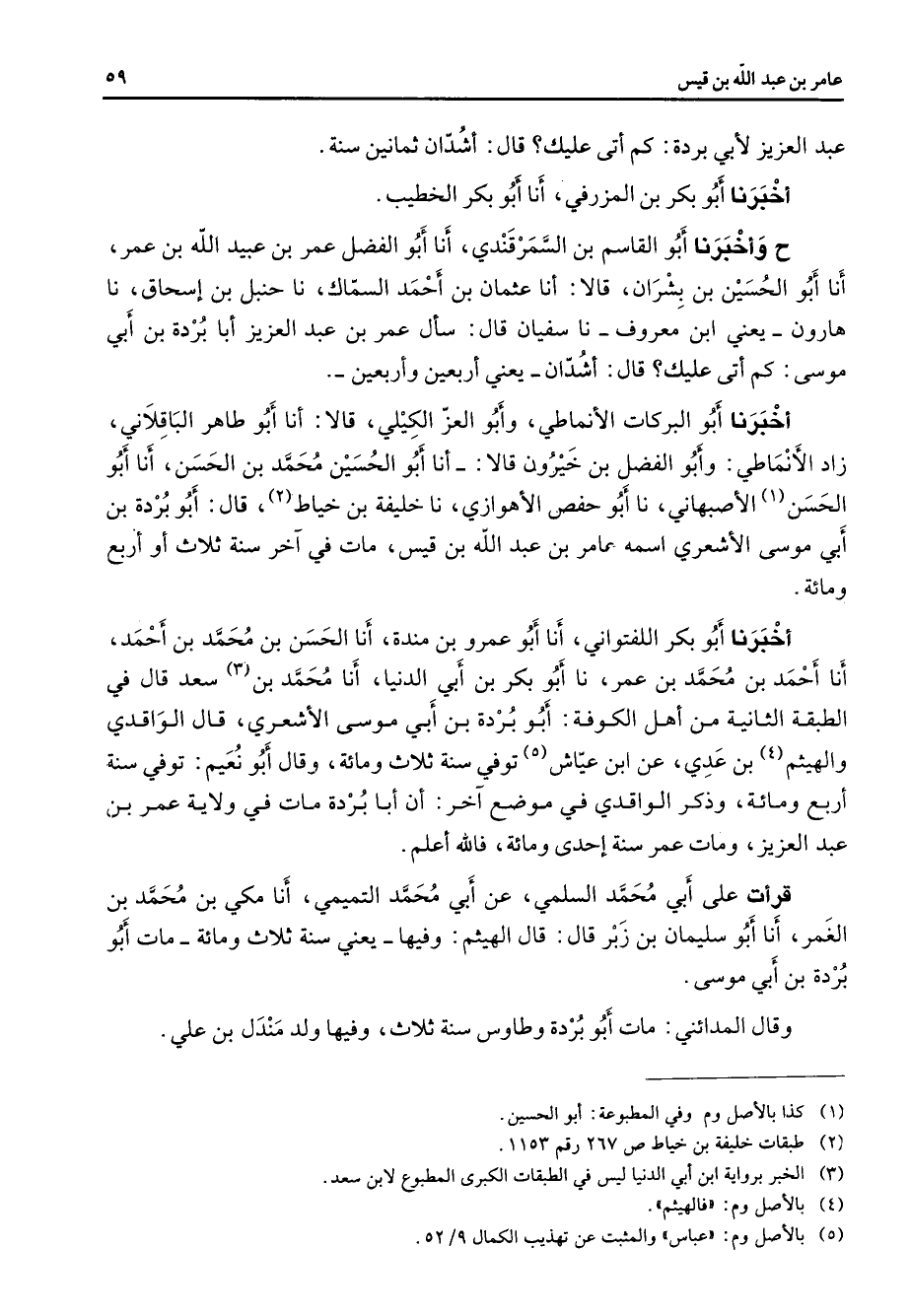 عبد العزيز لأبي بردة كم أتى عليك قال أشدان ثمانين سنة أخبرنا أبو بكر بن المزرفي أنا أبو بكر الخطيب ح وأخبرنا أبو القاسم بن السمرقندي أنا أبو الفضل عمر بن عبيد الله بن عمر أنا أبو الحسين بن بشران قالا أنا عثمان بن أحمد السماك نا حنبل بن إسحاق نا هارون يعني ابن معروف نا سفيان قال سأل عمر بن عبد العزيز أبا بردة بن أبي موسى كم أتى عليك قال أشدان يعني أربعين وأربعين أخبرنا أبو البركات الأنماطي وأبو العز الكيلي قالا أنا أبو طاهر الباقلاني زاد الأنماطي وأبو الفضل بن خيرون قالا أنا أبو الحسين محمد بن الحسن أنا أبو الحسن (1) الأصبهاني نا أبو حفص الأهوازي نا خليفة بن خياط (2) قال أبو بردة بن أبي موسى الأشعري اسمه عامر بن عبد الله بن قيس مات في آخر سنة ثلاث أو أربع ومائة أخبرنا أبو بكر اللفتواني أنا أبو عمرو بن مندة أنا الحسن بن محمد بن أحمد أنا أحمد بن محمد بن عمر نا أبو بكر بن أبي الدنيا أنا محمد بن سعد قال في الطبقة الثانية من أهل الكوفة أبو بردة بن أبي موسى الأشعري قال الواقدي والهيثم (4) بن عدي عن ابن عياش (5) توفي سنة ثلاث ومائة وقال أبو نعيم توفي سنة أربع ومائة وذكر الواقدي في موضع آخر أن أبا بردة مات في ولاية عمر بن عبد العزيز ومات عمر سنة إحدى ومائة فالله أعلم قرأت على أبي محمد السلمي عن أبي محمد التميمي أنا مكي بن محمد بن الغمر أنا أبو سليمان بن زبر قال قال الهيثم وفيها يعني سنة ثلاث ومائة مات أبو بردة بن أبي موسى وقال المدائني مات أبو بردة وطاوس سنة ثلاث وفيها ولد مندل بن علي