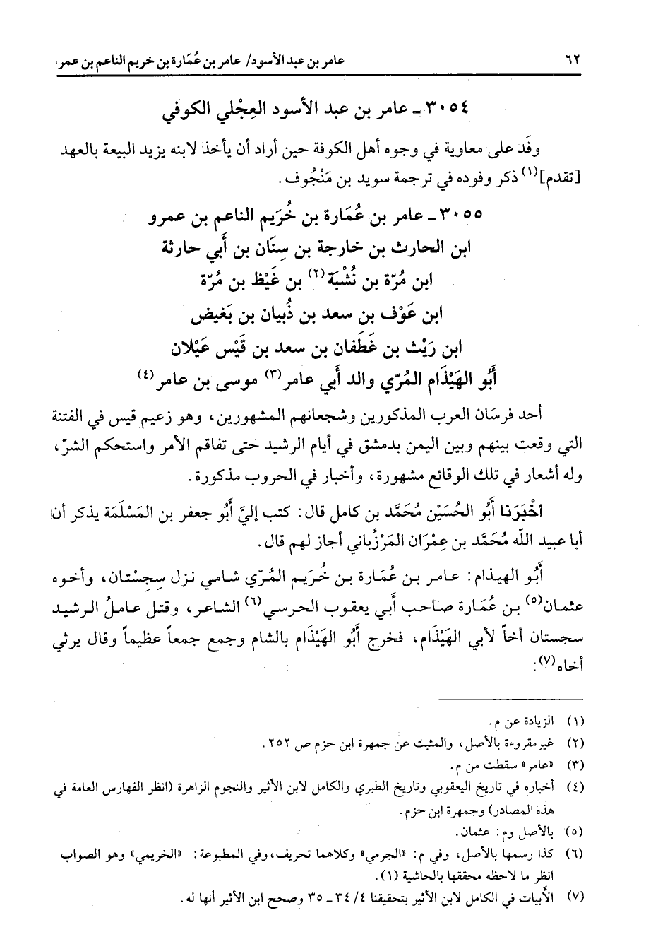 3054 - عامر بن عبد الأسود العجلي الكوفي وفد على معاوية في وجوه أهل الكوفة حين أراد أن يأخذ لابنه يزيد البيعة بالعهد تقدم (1) ذكر وفوده في ترجمة سويد بن منجوف