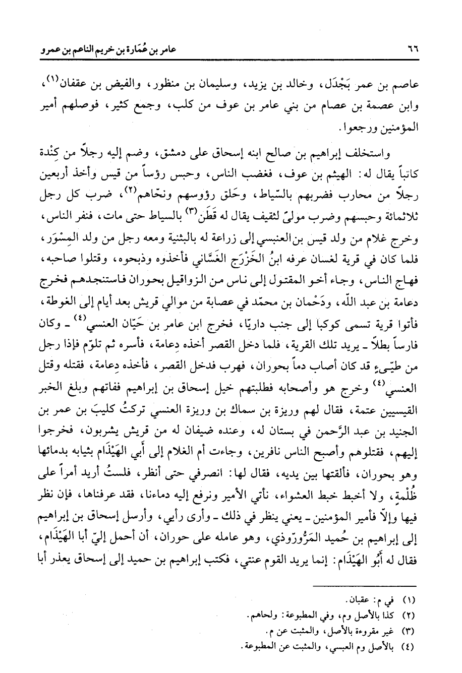 عاصم بن عمر بجدل وخالد بن يزيد وسليمان بن منظور والفيض بن عقفان (1) وابن عصمة بن عصام من بني عامر بن عوف من كلب وجمع كثير فوصلهم أمير المؤمنين ورجعوا واستخلف إبراهيم بن صالح ابنه إسحاق على دمشق وضم إليه رجلا من كندة كاتبا يقال له الهيثم بن عوف فغضب الناس وحبس رؤسا من قيس وأخذ أربعين رجلا من محارب فضربهم بالسياط وحلق رؤوسهم ونحاهم (2) ضرب كل رجل ثلاثمائة وحبسهم وضرب مولى لثقيف يقال له قطن (3) بالسياط حتى مات فنفر الناس وخرج غلام من ولد قيس بن العنبسي إلى زراعة له بالبثنية ومعه رجل من ولد المسور فلما كان في قرية لغسان عرفه ابن الخزرج الغساني فأخذوه وذبحوه وقتلوا صاحبه فهاج الناس وجاء أخو المقتول إلى ناس من الزواقيل بحوران فاستنجدهم فخرج دعامة بن عبد الله ودحمان بن محمد في عصابة من موالي قريش بعد أيام إلى الغوطة فأتوا قرية تسمى كوكبا إلى جنب داريا فخرج ابن عامر بن حيان العنسي (4) وكان فارسا بطلا يريد تلك القرية فلما دخل القصر أخذه دعامة فأسره ثم تلوم فإذا رجل من طيئ قد كان أصاب دما بحوران فهرب فدخل القصر فأخذه دعامة فقتله وقتل العنسي (4) وخرج هو وأصحابه فطلبتهم خيل إسحاق بن إبراهيم ففاتهم وبلغ الخبر القيسيين عتمة فقال لهم وريزة بن سماك بن وريزة العنسي تركت كليب بن عمر بن الجنيد بن عبد الرحمن في بستان له وعنده ضيفان له من قريش يشربون فخرجوا إليهم فقتلوهم وأصبح الناس نافرين وجاءت أم الغلام إلى أبي الهيذام بثيابه بدمائها وهو بحوران فألقتها بين يديه فقال لها انصرفي حتى أنظر فلست أريد أمرا على ظلمه ولا أخبط خبط العشواء نأتي الأمير ونرفع إليه دماءنا فقد عرفناها فإن نظر فيها وإلا فأمير المؤمنين يعني ينظر في ذلك وأرى رأيي وأرسل إسحاق بن إبراهيم إلى أبراهيم بن حميد المروروذي وهو عامله على حوران أن أحمل إلي أبا الهيذام فقال له أبو الهيذام إنما يريد القوم عنتي فكتب إبراهيم بن حميد إلى إسحاق يعذر أبا