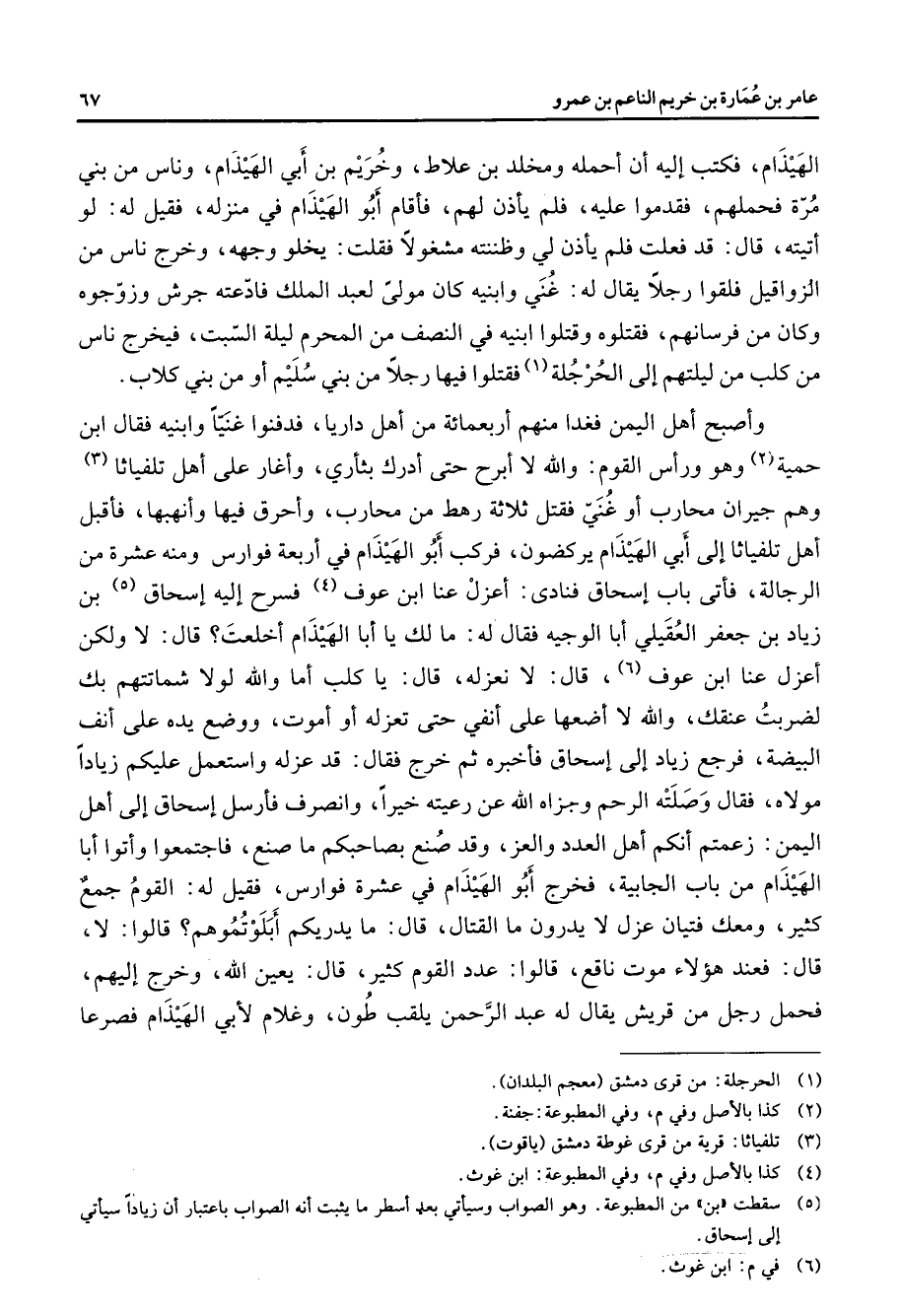 الهيذام الهيذام فكتب إليه أن أحمله ومخلد بن علاط وخريم بن أبي الهيذام وناس من بني مرة فحملهم فقدموا عليه فلم يأذن لهم فأقام أبو الهيذام في منزله فقيل له لو أتيته قال قد فعلت فلم يأذن لي وظننته مشغولا فقلت يخلو وجهه وخرج ناس من الزواقيل فلقوا رجلا يقال له غني وابنيه كان مولى لعبد الملك فادعته جرش وزوجوه وكان من فرسانهم فقتلوه وقتلوا ابنيه في النصف من المحرم ليلة السبت فيخرج ناس من كلب من ليلتهم إلى الحرجلة (1) فقتلوا فيها رجلا من بني سليم أو من بني كلاب وأصبح أهل اليمن فغدا منهم أربعمائة من أهل داريا فدفنوا غنيا وابنيه فقال ابن حمية (2) وهو ورأس القوم والله لا أبرح حتى أدرك بثأري وأغار على أهل تلفياثا (3) وهم جيران محارب أو غني فقتل ثلاثة رهط من محارب وأحرق فيها وأنهبها فأقبل أهل تلفياثا إلى أبي الهيذام يركضون فركب أبو الهيذام في أربعة فوارس ومنه عشرة من الرجالة فأتى باب إسحاق فنادى أعزل عنا ابن عوف (4) فسرح إليه إسحاق (5) بن زياد بن جعفر العقيلي أبا الوجيه فقال له مالك يا أبا الهيذام أخلعت قال لا ولكن أعزل عنا ابن عوف (6) قال لا نعزله قال يا كلب أما والله لولا شماتتهم بك لضربت عنقك والله لا أضعها على أنفي حتى تعزله أو أموت ووضع يده على أنف البيضة فرجع زياد إلى إسحاق فأخبره ثم خرج فقال قد عزله واستعمل عليكم زيادا مولاه فقال وصلته الرحم وجزاه الله عن رعيته خيرا وانصرف فأرسل إسحاق إلى أهل اليمن زعمتم أنكم أهل العدد والعز وقد صنع بصاحبكم ما صنع فاجتمعوا وأتوا أبا الهيذام من باب الجابية فخرج أبو الهيذام في عشرة فوارس فقيل له القوم جمع كثير ومعك فتيان عزل لا يدرون ما القتال قال ما يدريكم أبلوتموهم قالوا لا قال فعند هؤلاء موت ناقع قالوا عدد القوم كثير قال يعين الله وخرج إليهم فحمل رجل من قريش يقال له عبد الرحمن يلقب طون وغلام لأبي الهيذام فصرعا