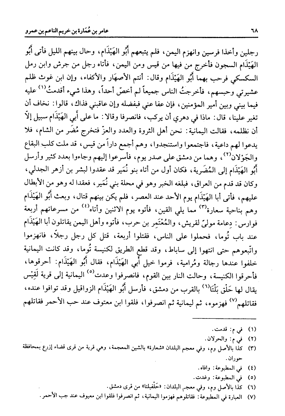 رجلين وأخذا فرسين وانهزم اليمن فلم يتبعهم أبو الهيذام وحال بينهم الليل فأتى أبو الهيذام السجون فأخرج من فيها من قيس ومن اليمن فأتاه رجل من جرش وابن رمل السكسكي فرحب بهما أبو الهيذام وقال أنتم الأصهار والأكفاء وإن ابن غوث ظلم عشيرتي وحبسهم فأخرجت الناس جميعا لم أخص أحدا وهذا شئ أقدمت (1) عليه فيما بيني وبين أمير المؤمنين فإن عفا عني فبفضله وإن عاقبني فذاك قالوا نخاف أن تغير علينا قال ماذا في دهري أن يركب فانصرفا وقالا ما على أبي الهيذام سبيل إلا أن نظلمه فقالت اليمانية نحن أهل الثروة والعدد والعز فتخرج مضر من الشام فلا يدعوا لهم داعية فاجتمعوا واستنجدوا وهم أجمع دارا من قيس قد ملت كلب البقاع والجولان (2) وهما من دمشق على صدر يوم فأسرعوا إليهم وجاءوا بعدد كثير وأرسل أبو الهيذام إلى المضرية فكان أول من أتاه بنو نمير قد عقدوا لبشر بن أزهر الجدلي وكان قد قدم من العراق فبلغه الخبر وهو في محله بن نمير فعقدا له وهو من الأبطال عليهم فأتى أبا الهيذام يوم الأحد عند العصر فلم يكن بينهم قتال وبعث أبو الهيذام وهم بناحية سعارة (3) مما يلي القين فأتوه يوم الاثنين وأتاه (4) من مسرعاتهم أربعة فوارس دعامة مولى لقريش والمعتمر بن حرب فأتوه وأهل اليمن يقاتلون أبا الهيذام عند باب توما فحملوا على الناس فقتلوا أربعة قتل كل رجل رجلا فانهزموا واتبعوهم حتى انتهوا إلى ساباط وقد قطع الطريق لكنسية توما وقد كانت اليمانية خلفوا عندها رجالة ومرامية فرموا خيل أبي الهيذام فقال أبو الهيذام أحرقوها فأحرقوا الكنيسة وحالت النار بين القوم فانصرفوا وعدت (5) اليمانية إلى قرية لقيس يقال لها حلق بلتا (6) بالقرب من دمشق فأرسل أبو الهيذام الزواقيل وقد توافوا عنده فقاتلهم (7) فهزموه ثم ليمانية ثم انصرفوا فلقوا ابن معتوف عند حب الأحمر فقاتلهم