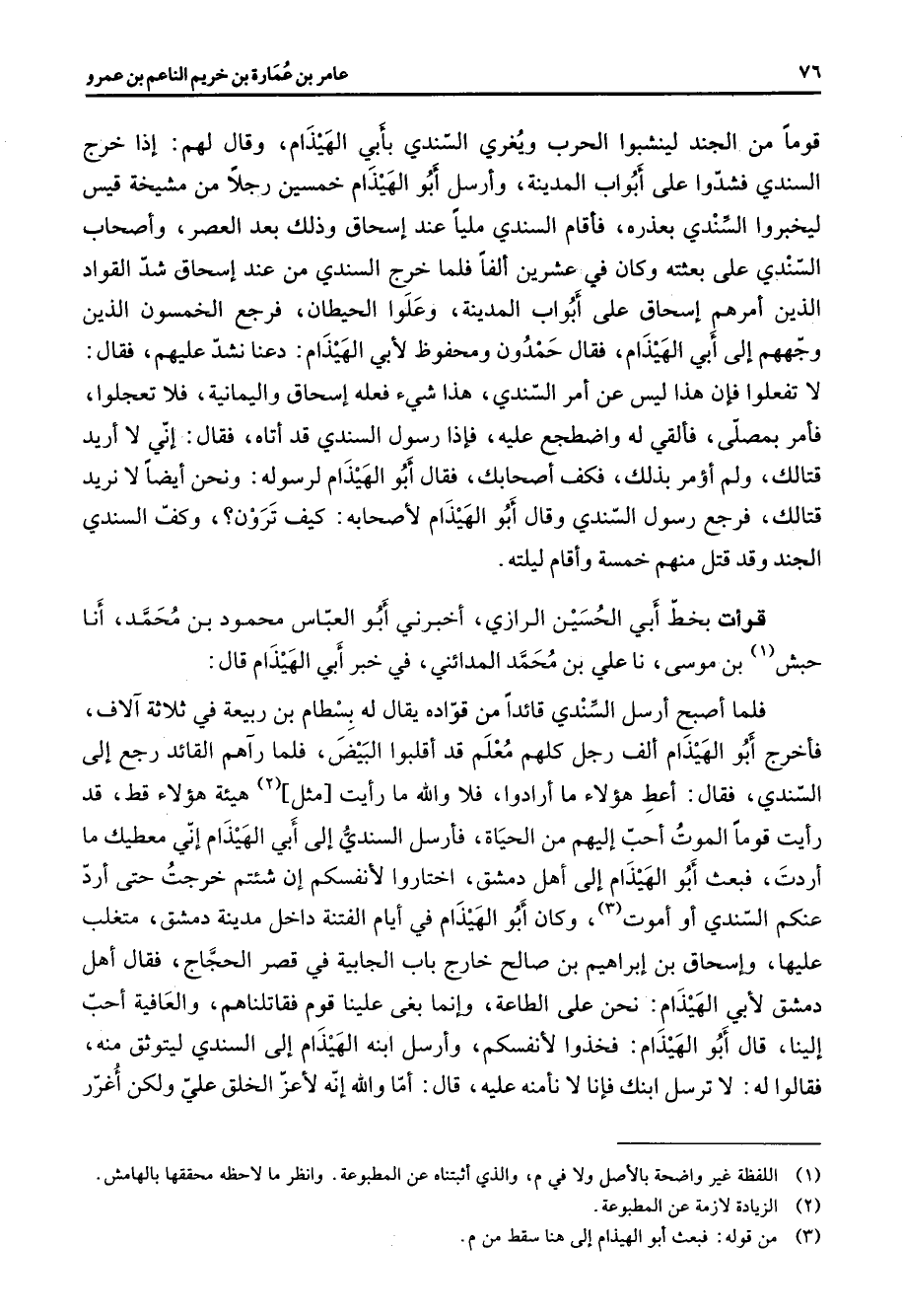 قوما من الجند لينشبوا الحرب ويغري السندي بأبي الهيذام وقال لهم إذا خرج السندي فشدوا على أبواب المدينة وأرسل أبو الهيذام خمسين رجلا من مشيخة قيس ليخبوا السندي بعذره فأقام السندي مليا عند إسحاق وذلك بعد العصر وأصحاب السندي على بعثته وكان في عشرين ألفا فلما خرج السندي من عند إسحاق شد القواد الذين أمرهم إسحاق على أبواب المدينة وعلوا الحيطان فرجع الخمسون الذين وجههم إلى أبي الهيذام فقال حمدون ومحفوظ لأبي الهيذام دعنا نشد عليهم فقال لا تفعلوا فإن هذا ليس عن أمر السندي هذا شئ فعله إسحاق واليمانية فلا تعجلوا فأمر بمصلى فألقي له واضطجع عليه فإذا رسول السندي قد أتاه فقال إني لا أريد قتالك ولم أؤمر بذلك فكف أصحابك فقال أبو الهيذام لرسوله ونحن أيضا لا نريد قتالك فرجع رسول السندي وقال أبو الهيذام لأصحابه كيف ترون وكف السندي الجند وقد قتل منهم خمسة وأقام ليلته قرأت بخط أبي الحسين الرازي أخبرني أبو العباس محمود بن محمد أنا حبش (1) بن موسى نا علي بن محمد المدائني في خبر أبي الهيذام قال فلما أصبح أرسل السندي قائدا من قواده يقال له بسطام بن ربيعة في ثلاثة آلاف فأخرج أبو الهيذام ألف رجل كلهم معلم قد أقلبوا البيض فلما رآهم القائد رجع إلى السندي فقال أعط هؤلاء ما أرادوا فلا والله ما رأيت مثل (2) هيئة هؤلاء قط قد رأيت قوما الموت أحب إليهم من الحياة فأرسل السندي إلى أبي الهيذام إني معطيك ما أردت فبعث أبو الهيذام إلى أهل دمشق اختاروا لأنفسكم إن شئتم خرجت حتى أرد عنكم السندي أو أموت (3) وكان أبو الهيذام في أيام الفتنة داخل مدينة دمشق متغلب عليها وإسحاق بن إبراهيم بن صالح خارج باب الجابية في قصر الحجاج فقال أهل دمشق لأبي الهيذام نحن على الطاعة وإنما بغى علينا قوم فقاتلناهم والعافية أحب إلينا قال أبو الهيذام فخذوا لأنفسكم وأرسل ابنه الهيذام إلى السندي ليتوثق منه فقالوا له لا ترسل ابنك فإنا لا نأمنه عليه قال أما والله إنه لأعز الخلق علي ولكن أغرر