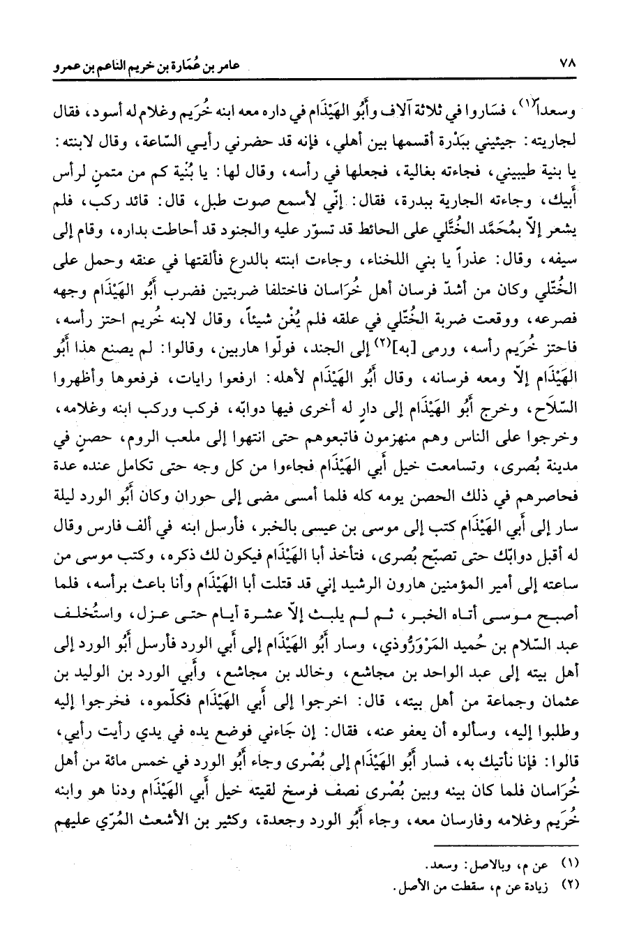 وسعدا (1) فساروا في ثلاثة آلاف وأبو الهيذام في داره معه ابنه خريم وغلام له أسود فقال لجاريته جيئيني ببدرة أقسمها بين أهلي فإنه قد حضرني رأيي الساعة وقال لابنته يا بنية طيبيني فجاءته بغالية فجعلها في رأسه وقال لها يا بنية كم من متمن لرأس أبيك وجاءته الجارية ببدرة فقال إني لأسمع صوت طبل قال قائد ركب فلم يشعر إلا بمحمد الختلي على الحائط قد تسور عليه والجنود قد أحاطت بداره وقام إلى سيفه وقال عذرا يا بني اللخناء وجاءت ابنته بالدرع فألقتها في عنقه وحمل على الختلي وكان من أشد فرسان أهل خراسان فاختلفا ضربتين فضرب أبو الهيذام وجهه فصرعه ووقعت ضربة الختلي في علقه فلم يغن شيئا وقال لابنه خريم احتز رأسه فاحتز خريم رأسه ورمى به (2) إلى الجند فولوا هاربين وقالوا لم يصنع هذا أبو الهيذام إلا ومعه فرسانه وقال أبو الهيذام لأهله ارفعوا رايات فرفعوها وأظهروا السلاح وخرج أبو الهيذام إلى دار لهأخرى فيها دوابه فركب وركب ابنه وغلامه وخرجوا على الناس وهم منهزمون فاتبعوهم حتى انتهوا إلى ملعب الروم حصن في مدينة بصرى وتسامعت خيل أبي الهيذام فجاءوا من كل وجه حتى تكامل عنده عدة فحاصرهم في ذلك الحصن يومه كله فلما أمسى مضى إلى حوران وكان أبو الورد ليلة سار إلى أبي الهيذام كتب إلى موسى بن عيسى بالخبر فأرسل ابنه في ألف فارس وقال له أقبل دوابك حتى تصبح بصرى فتأخذ أبا الهيذام فيكون لك ذكره وكتب موسى من ساعته إلى أمير المؤمنين هارون الرشيد إني قد قتلت أبا الهيذام وأنا باعث برأسه فلما أصبح موسى أتاه الخبر ثم لم يلبث إلا عشرة أيام حتى عزل واستخلف عبد السلام بن حميد المروروذي وسار أبو الهيذام إلى أبي الورد فأرسل أبو الورد إلى أهل بيته إلى عبد الواحد بن مجاشع وخالد بن مجاشع وأبي الورد بن الوليد بن عثمان وجماعة من أهل بيته قال اخرجوا إلى أبي الهيذام فكلموه فخرجوا إليه وطلبوا إليه وسألوه أن يعفو عنه فقال إن جاءني فوضع يده في يدي رأيت رأيي قالوا فإنا نأتيك به فسار أبو الهيذام إلى بصرى وجاء أبو الورد في خمس مائة من أهل خراسان فلما كان بينه وبين بصرى نصف فرسخ لقيته خيل أبي الهيذام ودنا هو وابنه خريم وغلامه وفارسان معه وجاء أبو الورد وجعدة وكثير بن الأشعث المري عليهم
