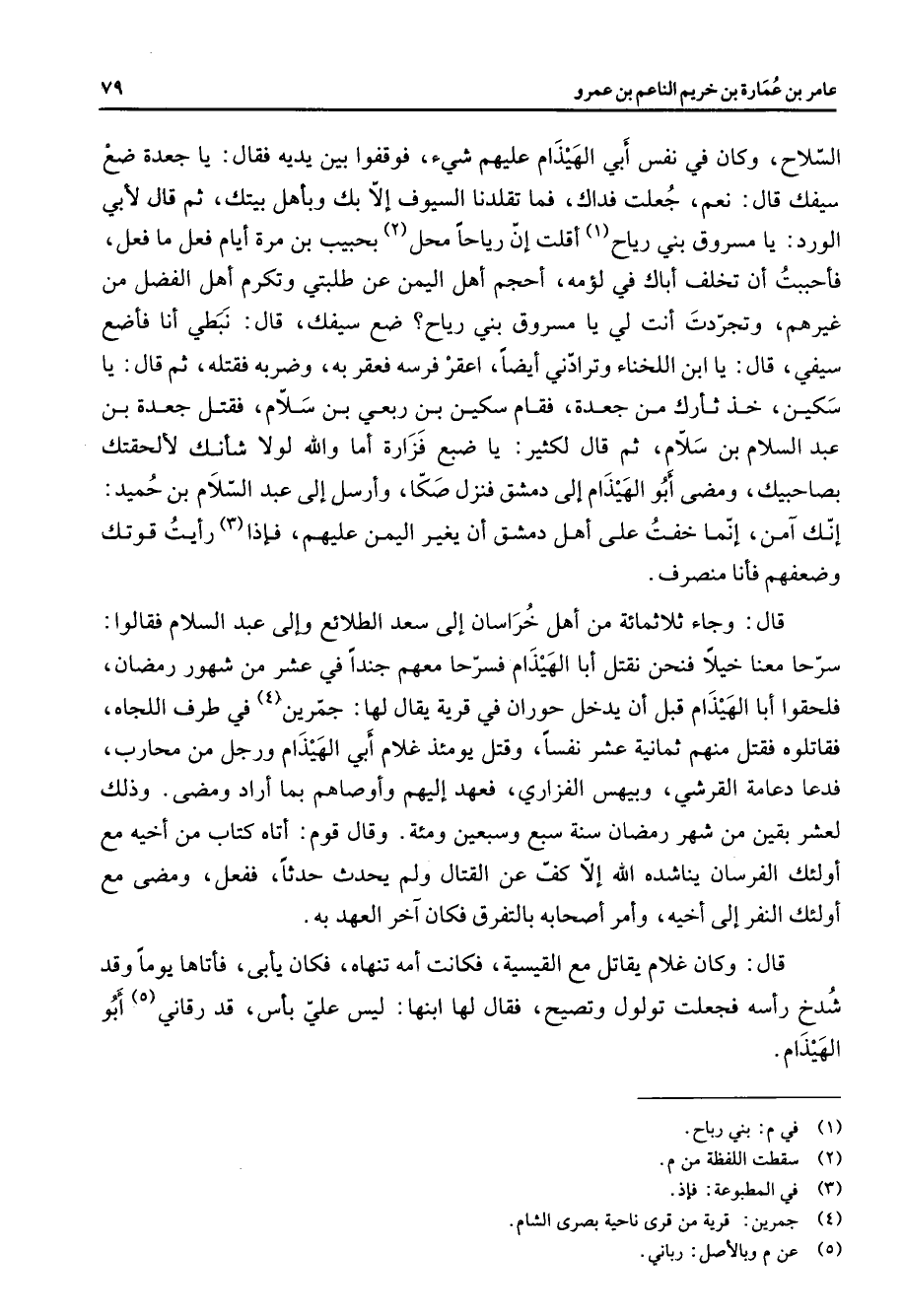 السلاح وكان في نفس أبي الهيذام عليهم شئ فوقفوا بين يديهفقال يا جعدة ضع سيفك قال نعم جعلت فداك فما تقلدنا السيوف إلا بك وبأهل بيتك ثم قال لأبي الورد يا مسروق بني رياح (1) أقلت إن رياحا محل (2) بحبيب بن مرأيام فعل ما فعل فأحببت أن تخلف أباك في لؤمه أحجم أهل اليمن عن طلبتي وتكرم أهل الفضل من غيرهم وتجردت أنت لي يا مسروق بني رياح ضع سيفك قال نبطي أنفأضع سيفي قال يا ابن اللخناء وترادني أيضا اعقر فرسه فعقر به وضربه فقتله ثم قال يا سكين خذ ثأرك من جعدة فقام سكين بن ربعي بن سلام فقتل جعدة بن عبد السلام بن سلام ثم قال لكثير يا ضبع فزارة أما والله لولا شأنك لألحقتك بصاحبيك ومضى أبو الهيذام إلى دمشق فنزل صكا وأرسل إلى عبد السلام بن حميد إنك آمن إنما خفت على أهل دمشق أن يغير اليمن عليهم فإذا (3) رأيت قوتك وضعفهم فأنا منصرف قال وجاء ثلاثمائة من أهل خراسان إلى سعد الطلائع وإلى عبد السلام فقالوا سرحا معنا خيلا فنحن نقتل أبا الهيذام فسرحا معهم جندا في عشر من شهور رمضان فلحقوا أبا الهيذام قبل أن يدخل حوران في قرية يقال لها جمرين (4) في طرف اللجاه فقاتلوه فقتل منهم ثمانية عشر نفسا وقتل يومئذ غلام أبي الهيذام ورجل من محارب فدعا دعامة القرش وبيهس الفزاري فعهد إليهم وأوصاهم بما أراد ومضى وذلك لعشر بقين من شهر رمضان سنة سبع وسبعين ومئة وقال قوم أتاه كتاب من أخيه مع أولئك الفرسان يناشده اللهإلا كف عن القتال ولم يحدث حدثا ومضى مع أولئك النفر إلى أخيه وأمر أصحابه بالتفرق فكان آخر العهد به قال وكان غلام يقاتل مع القيسية فكانت أمه تنهاه فكان يأبى فأتاها يوما وقد شدخ رأسه فجعلت تولول وتصيح فقال لها ابنها ليس علي بأس قد رقاني (5) أبو الهيذام