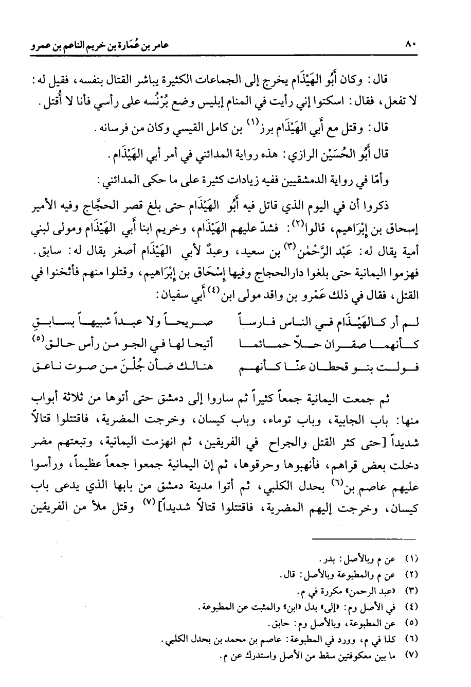 قال وكان أبو الهيذام يخرج إلى الجماعات الكثيرة يباشر القتال بنفسه فقيل له لا تفعل فقال اسكتوا إني رأيت في المنام إبليس وضع برنسه على رأسي فأنا لا أقتل قال وقتل مع أبي الهيذام برز (1) بن كامل القيسي وكان من فرسانه قال أبو الحسين الرازي هذه رواية المدائني في أمر أبي الهيذام وأما في رواية الدمشقيين ففيه زيادات كثيرة على ما حكى المدائني ذكروا أن في اليوم الذي قاتل فيه أبو الهيذام حتى بلغ قصر الحجاج وفيه الأمير إسحاق بن إبراهيم قالوا (2) فشد عليهم الهيذام وخريم ابنا أبي الهيذام ومولى لبني أميه يقال له عبد الرحمن (3) بن سعيد وعبد لأبي الهيذام أصغر يقال له سابق فهزموا اليمانية حتى بلغوا دار الحجاج وفيها إسحاق بن إبراهيم وقتلوا منهم فأثخنوا في القتل فقال فذلك عمرو بن واقد مولى ابن (4) أبي سفيان * لم أر كالهيذام في الناس فارسا * صريحا ولا عبدا شبيها بسابق كأنهما صقران حلا حمائما * أتيحا لها في الجو من رأس حالق (5) فولت بنو قحطان عنا كأنهم * هنالك ضأن جلن من صوت ناعق * ثم جمعت اليمانية جمعا كثيرا ثم ساروا إلى دمشق حتى أتوها من ثلاثة أبواب منها باب الجابية وباب توماء وباب كيسان وخرجت المضرية فاقتتلوا قتالا شديدا حتى كثر القتل والجراح في الفريقين ثم انهزمت اليمانية وتبعتهم مضر دخلت بعض قراهم فأنهبوها وحرقوها ثم إن اليمانية جمعوا جمعا عظيما ورأسوا عليهم عاصم بن (6) بحدل الكلبي ثم أتوا مدينة دمشق من بابها الذي يدعى باب كيسان وخرجت إليهم المضرية فاقتتلوا قتالا شديدا (7) وقتل ملأ من الفريقين