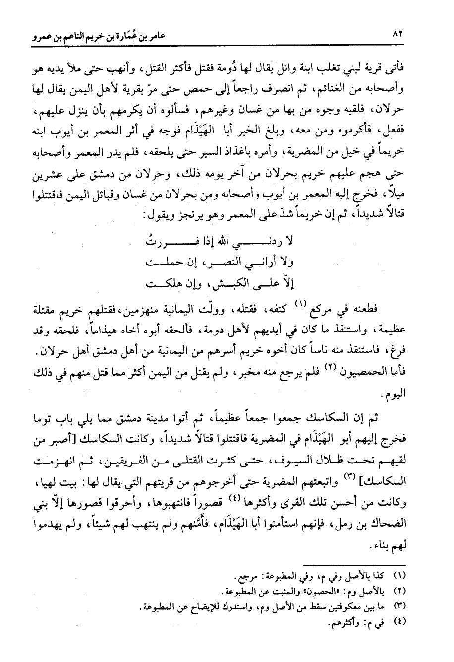 فأتى قرية لبني تغلب ابنة وائل يقال لها دومة فقتل فأكثر القتل وأنهب حتى ملأ يديه هو وأصحابه من الغنائم ثم انصرف راجعا إلى حمص حتى مر بقرية لأهل اليمن يقال لها حرلان فلقيه وجوه من بها من غسان وغيرهم فسألوه أن يكرمهم بأن ينزل عليهم ففعل فأكرموه ومن معه وبلغ الخبر أبا الهيذام فوجه في أثر المعمر بن أيوب ابنه خريما في خيل من المضرية وأمره باغذاذ السير حتى يلحقه فلم يدالمعمر وأصحابه حتى هجم عليهم خريم بحرلان من آخر يومه ذلك وحرلان من دمشق على عشرين ميلا فخرج إليه المعمر بن أيوب وأصحابه ومن بحرلان من غسان وقبائل اليمن فاقتتلوا قتالا شديدا ثم إن خريما شد على المعمر وهو يرتجز ويقول * لا ردني الله إذا فررت * ولا أراني النصر إذا حملت * إلا على الكبش وإن هلكت فطعنه في مركع (1) كتفه فقتله وولت اليمانية منهزمين فقتلهم خريم مقتلة عظيمة واستنفذ ماكان في أيديهم لأهل دومة فألحقه أبوه أخاه هيذاما فلحقه وقد فرغ فاستنقذ منه ناسا كان أخوه خريم أسرهم من اليمانية من أهل دمشق أهل حرلان فأما الحمصيون (2) فلم يرجع منه مخبر ولم يقتل من اليمن أكثر مما قتل منهم في ذلك اليوم ثم إن السكاسك جمعوا جمعا عظيما ثم أتوا مدينة دمشق مما يلي باب توما فخرج إليهم أبو الهيذام في المضرية فاقتتلوا قتالا شديدا وكانت السكاسك أصبر من لقيهم تحت ظلال السيوف حتى كثرت القتلى من الفريقين ثم انهزمت السكاسك (3) واتبعتهم المضرية حتى أخرجوهم من قريتهم التي يقال لها بيت لهيا وكانت من أحسن تلك القرى وأكثرها (4) قصورا فانتهبوها وأحرقوا قصورها إلا بني الضحاك بن رمل فإنهم استأمنوا أبا الهيذام فأمنهم ولم ينتهب لهم شيئا ولم يهدموا لهم بناء