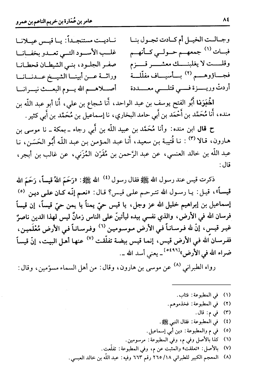وجالت الخيل أم كادت تجول بنا * ناديت مستنجدا يا قيس عيلانا * * فبات (1) جمعهم حولي كأنهم * غلب الأسود التي تعدو بخفانا وقلت لا يغلبنك معشر قزم * صفر الجلود بني الشيطان قحطانا فجاؤوهم (2) بأسياف مفللة * وراثة عن أبينا الشيخ عدنانا أردت وريزة في قتلي معددة * أصلاهم الله يوم البعث نيرانا * أخبرنا أبو الفتح يوسف بن عبد الواحد أنا شجاع بن علي أنا أبو عبد الله بن منده أنا محمد بن أحمد بن أبي حامد البخاري نا إسماعيل بن محمد بن أبي كثير ح قال ابن منده وأنا محمد بن عبيد الله بن أبي رجاء بمكة نا موسى بن هارون قالا (3) نا قتيبة بن سعيد أنا عبد المؤمن بن عبد الله أبو الحسن نا عبد الله بن خالد العنسي عن عبد الرحمن بن مقرن المزني عن غالب بن أبجر قال ذكرت قيس عند رسول الله (صلى الله عليه وسلم) فقال رسول (4) الله (صلى الله عليه وسلم) رحم الله قيسا رحم الله قيسا قيل يا رسول الله تترحم على قيس قال نعم أنه كان على دين (5) إسماعيل بن إبراهيم خليل الله عوجل يا قيس حي يمنا يا يمن حي قيسا إن قيسا فرسان الله في الأرض والذي نفسي بيده ليأتين على الناس زمان ليس لهذا الدين ناصر غير قيس إن لله فرسانا في الأرض موسومين (6) وفرسانا في الأرض معلمين ففرسان الله في الأرض قيس إنما قيس بيضة تفلقت (7) عنها أهل البيت إن قيسا ضراء الله في الأرض