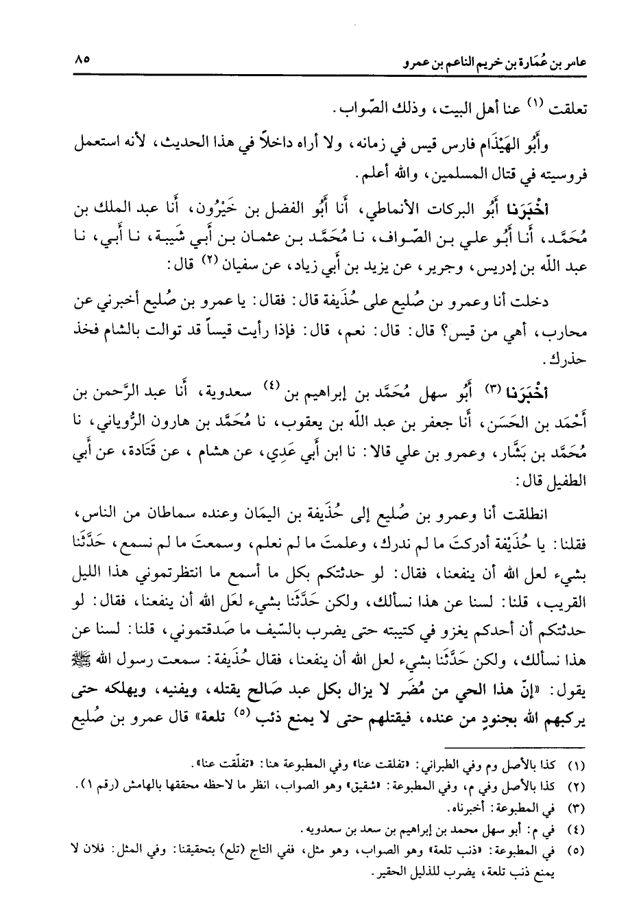 تعلقت (1) عنا أهل البيت وذلك الصواب وأبو الهيذام فارس قيس في زمانه ولا أراه داخلا في هذا الحديث لأنه استعمل فروسيته في قتال المسلمين والله أعلم أخبرنا أبو البركات الأنماطي أنا أبو الفضل بن خيرون أنا عبد الملك بن محمد أنا أبو علي بن الصواف نا محمد بن عثمان بن أبي شيبة نا أبي نا عبد الله بن إدريس وجرير عن يزيد بن أبي زياد عن سفيان (2) قال دخلت أنا وعمرو بن صليع على حذيفة قال فقال يا عمرو بن صليع أخبرني عن محارب أهي من قيس قال قال نعم قال فإذا رأيت قيسا قدتوالت بالشام فخذ حذرك أخبرنا (3) أبو سهل محمد بن إبراهيم بن (4) سعدوية أنا عبد الرحمن بن أحمد بن الحسن أنا جعفر بن عبد الله بن يعقوب نا محمد بن هارون الروياني نا محمد بن بشار وعمرو بن علي قالا نا ابن أبي عدي عن هشام عن قتادة عن أبي الطفيل قال انطلقت أنا وعمرو بن صليع إلى حذيفة بن اليمان وعنده سماطان من الناس فقلنا يا حذيفة أدركت ما لم ندرك وعلمت ما لم نعلم وسمعت ما لم نسمع حدثنا بشئ لعل الله أن ينفعنا فقال لو حدثتكم بكل ما أسمع ما انتظرتموني هذا الليل القريب قلنا لسنا عن هذا نسألك ولكن حدثنا بشئ لعل الله أن ينفعنا فقال لو حدثتكم أن أحدكم يغزو في كتيبته حتى يضرب بالسيف ما صدقتموني قلنا لسنا عن هذا نسألك ولكن حدثنا بشئ لعل الله أن ينفعنا فقال حذيفة سمعت رسول الله (صلى الله عليه وسلم) يقول إن هذا الحي من مضر لا يزال بكل عبد صالح يقتله ويفنيه ويهلكه حتى يركبهم الله بجنود من عنده فيقتلهم حتى لا يمنع ذئب تلعة قال عمرو بن صليع