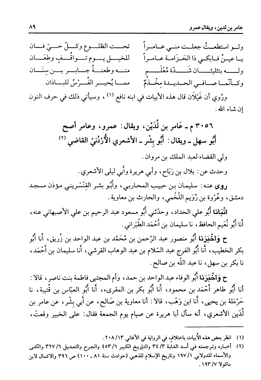 3056 - م عامر بن لدين ويقال عمرو وعامر أصح أبو سهل ويقال أبو بشر الأشعري الأردني القاضي (2) ولي القضاء لعبد الملك بن مروان وحدث عن بلال بن رباح وأبي هريرة وأبي ليلى الأشعري روى عنه سليمان بن حبيب المحاربي وأبو بشر القنسريني مؤذن مسجد دمشق وعروة بن رويم اللخمي والحارث بن معاوية أنبأنا أبو علي الحداد وحدثني أبو مسعود عبد الرحيم بن علي الأصبهاني عنه أنا أبو نعيم الحافظ نا سليمان بن أحمد الطبراني ح وأخبرنا أبو منصور عبد الرحمن بن محمد بن عبد الواحد بن زريق أنا أبو بكر الخطيب أنا أبو الفرج عبد السلام بن عبد الوهاب القرشي أنا سليمان بن أحمد نا بكر بن سهل نا عبد الله بن صالح ح وأخبرنا أبو الوفاء عبد الواحد بن حمد وأم المجتبي فاطمة بنت ناصر قالا أنا أبو طاهر أحمد بن محمود أنا أبو بكر بن المقرئ أنا أبو العباس بن قتيبة نا حرملة بن يحيى أنا ابن وهب قالا أنا معاوية بن صالح عن أبي بشر عن عامر بن لدين الأشعري أنه سأل أبا هريرة عن صيام يوم الجمعة فقال على الخبير وقعت