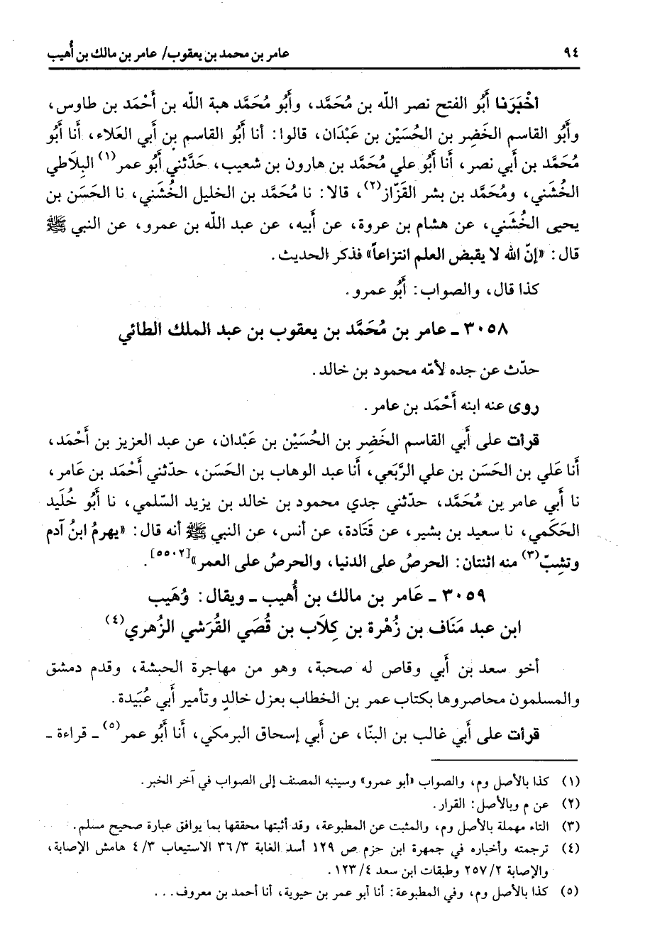 3059 - عامر بن مالك بن أهيب وقال وهيب ابن عبد مناف بن زهرة بن كلاب بن قصي القرشي الزهري (4) أخو سعد بن أبي وقاص له صحبة وهو من مهاجرة الحبشة وقدم دمشق والمسلمون محاصروها بكتاب عمر بن الخطاب بعزل خالد وتأمير أبي عبيدة قرأت على أبي غالب بن البنا عن أبي إسحاق البرمكي أنا أبو عمر (5) قراءة