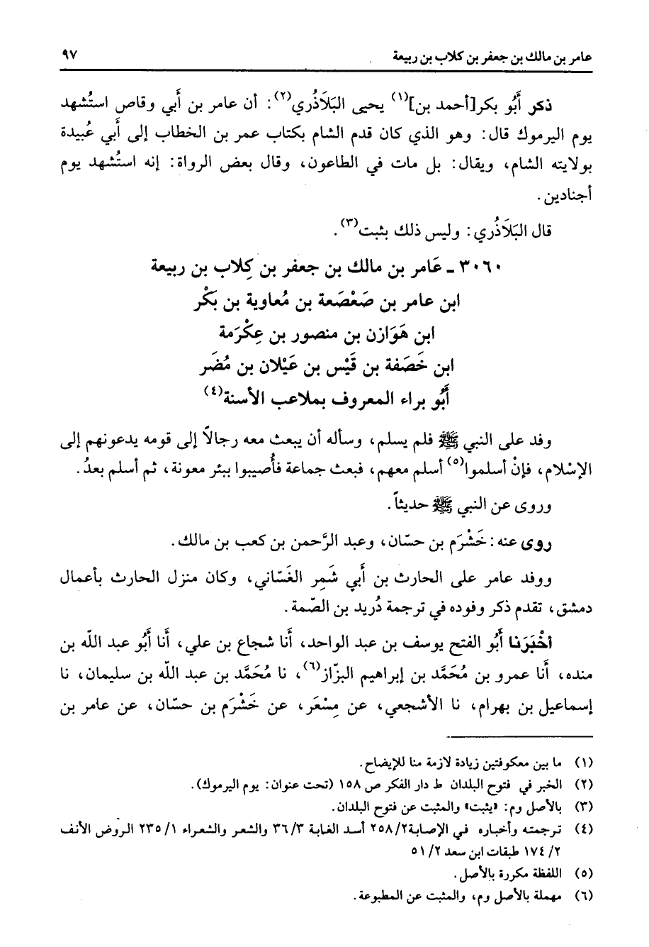 3060 - عامر بن مالك بن جعفر بن كلاب بن ربيعة ابن عامر بن صعصعة بن معاوية بن بكر ابن هوازن بن منصور بن عكرمة ابن خصفة بن قيس بن عيلان بن مضر أببراء المعروف بملاعب الأسنة (4) وفد على النبي (صلى الله عليه وسلم) فلم يسلم وسأله أن يبعث معه رجالا إلى قومه يدعونهم إلى الإسلام فإن أسلموا (5) أسلم معهم فبعث جماعة فأصيبوا ببئر معونة ثم أسلم بعد وروى عن النبي (صلى الله عليه وسلم) حديثا روى عنه خشرم بن حسان وعبد الرحمن بن كعب بن مالك