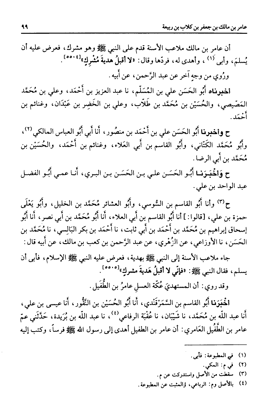 أن عامر بن مالك ملاعب الأسنة قدم على النبي (صلى الله عليه وسلم) وهو مشرك فعرض عليه أن يسلم وأبى (1) وأهدى له فردها وقال لا أقبل هدية مشرك
