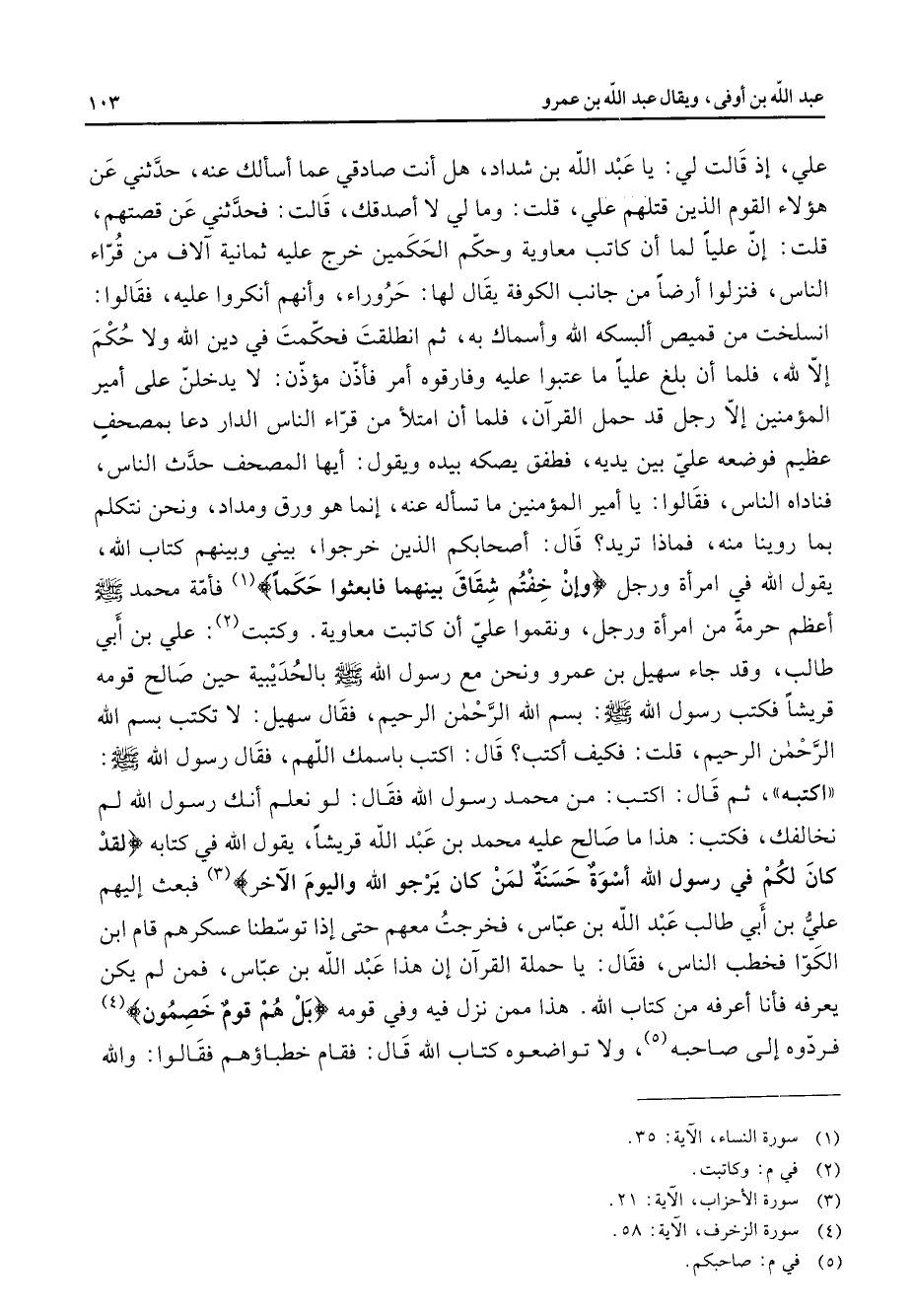 علي إذ قالت لي يا عبد الله بن شداد هل أنت صادقي عما أسألك عنه حدثني عن هؤلاء القوم الذين قتلهم علي قلت وما لي لا أصدقك قالت فحدثني عن قصتهم قلت إن عليا لما أن كاتب معاوية وحكم الحكمين خرج عليه ثمانية آلاف من قراء الناس فنزلوا أرضا من جانب الكوفة يقال لها حروراء وأنهم أنكروا عليه فقالوا انسلخت من قميص ألبسكه الله وأسماك به ثم انطلقت فحكمت في دين الله ولا حكم إلا لله فلما أن بلغ عليا ما عتبوا عليه وفارقوه أمر فأذن مؤذن لا يدخلن على أمير المؤمنين إلا رجل قد حمل القرآن فلما أن امتلأ من قراء الناس الدار دعا بمصحف عظيم فوضعه علي بين يديه فطفق يصكه بيده ويقول أيها المصحف حدث الناس فناداه الناس فقالوا يا أمير المؤمنين ما تسأله عنه إنما هو ورق ومداد ونحن نتكلم بما روينا منه فماذا تريد قال أصحابكم الذين خرجوا بيني وبينهم كتاب الله يقول الله في امرأة ورجل " وإن خفتم شقاق بينهما فابعثوا حكما " (1) فأمة محمد (صلى الله عليه وسلم) أعظم حرمة من امرأة ورجل ونقموا علي أن كاتبت معاوية وكتبت (2) علي بن أبي طالب وقد جاء سهيل بن عمرو ونحن مع رسول الله (صلى الله عليه وسلم) بالحديبية حين صالح قومه قريشا فكتب رسول الله (صلى الله عليه وسلم) بسم الله الرحمن الرحيم فقال سهيل لا تكتب بسم الله الرحمن الرحيم قلت فكيف أكتب قال اكتب باسمك اللهم فقال رسول الله (صلى الله عليه وسلم) اكتبه ثم قال اكتب من محمد رسول الله فقال لو نعلم أنك رسول الله لم نخالفك فكتب هذا ما صالح عليه محمد بن عبد الله قريشا يقول الله في كتابه " لقد كان لكم في رسول الله أسوة حسنة لمن كان يرجو الله واليوم الآخر " (3) فبعث إليهم علي بن أبي طالب عبد الله بن عباس فخرجت معهم حتى إذا توسطنا عسكرهم قام ابن الكوا فخطب الناس فقال يا حملة القرآن إن هذا عبد الله بن عباس فمن لم يكن يعرفه فأنا أعرفه من كتاب الله هذا ممن نزل فيه وفي قومه " بل هم قوم خصمون " (4) فردوه إلى صاحبه (5) ولا تواضعوه كتاب الله قال فقام خطباؤهم فقالوا والله