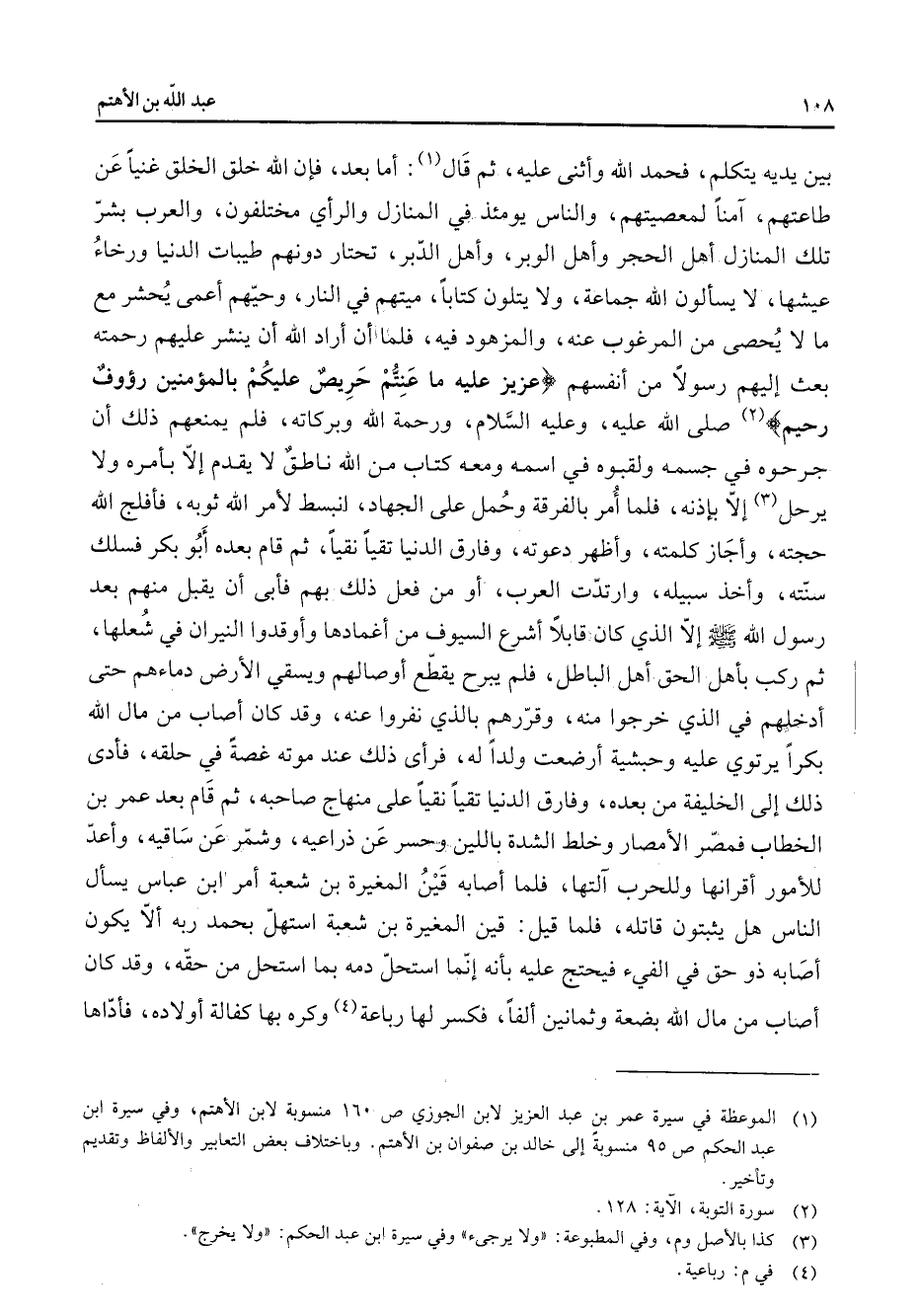 بين يديه يتكلم فحمد الله وأثنى عليه ثم قال (1) أما بعد فإن الله خلق الخلق عنيا عن طاعتهم آمنا لمعصيتهم والناس يومئذ في المنازل والرأي مختلفون والعرب بشر تلك المنازل أهل الحجر وأهل الوبر وأهل الدبر تحتار دونهم طيبات الدنيا ورخاء عيشها لا يسألون الله جماعة ولا يتلون كتأبا ميتهم في النار وحيهم أعمى يحشر مع ما لا يحصى من المرغوب عنه والمزهود فيه فلما أن أراد الله أن ينشر عليهم رحمته بعث إليهم رسولا من أنفسهم " عزيز عليه ما عنتم حريص عليكم بالمؤمنين رؤوف رحيم " (2) صلى الله عليه وعليه السلام ورحمة الله وبركاته فلم يمنعهم ذلك أن جرحوه في جسمه ولقبوه في أسمه ومعه كتاب من الله ناطق لا يقدم إلا بأمره ولا يرحل (3) إلا بإذنه فلما أمر بألفرقة وحمل على الجهاد انبسط لأمر الله ثوبه فأفلج الله حجته وأجاز كلمته وأظهر دعوته وفارق الدنيا تقيا نقيا ثم قام بعده أبو بكر فسلك سنته واخذ سبيله وارتدت العرب أو من فعل ذلك بهم فأبى أن يقبل منهم بعد رسول الله (صلى الله عليه وسلم) إلا الذي كان قابلا أشرع السيوف من أغمادها وأوقدوا النيران في شعلها ثم ركب بأهل الحق أهل الباطل فلم يبرح يقطع أوصالهم ويسقى الأرض دماءهم حتى أدخلهم في الذي خرجوا منه وقررهم بالذي نفروا عنه وقد كان أصاب من مال الله بكرا يرتوي عليه وحبشية أرضعت ولدا له فرأى ذلك عند موته غضة في حلقه فأدى ذلك إلى الخليفة من بعده وفارق الدنيا تقيا نقيا على منهاج صاحبه ثم قام بعد عمر بن الخطاب فمصر الأمصار وخلط الشدة باللين وحسر عن ذراعيه وشمر عن ساقيه وأعد للأمور أقرانها وللحرب آلتها فلما أصابه قين المغيرة بن شعبة أمر ابن عباس يسأل الناس هل يثبتون قاتله فلما قيل قين المغيرة بن شعبة استهل بحمد ربه ألا يكون أصابه ذو حق في الفئ فيحتج عليه بأنه إنما استحل دمه بما استحل من حقه وقد كان أصاب من مال الله بضعة وثمانين ألفا فكسر لها رباعة (4) وكره بها كفالة أولاده فأداها