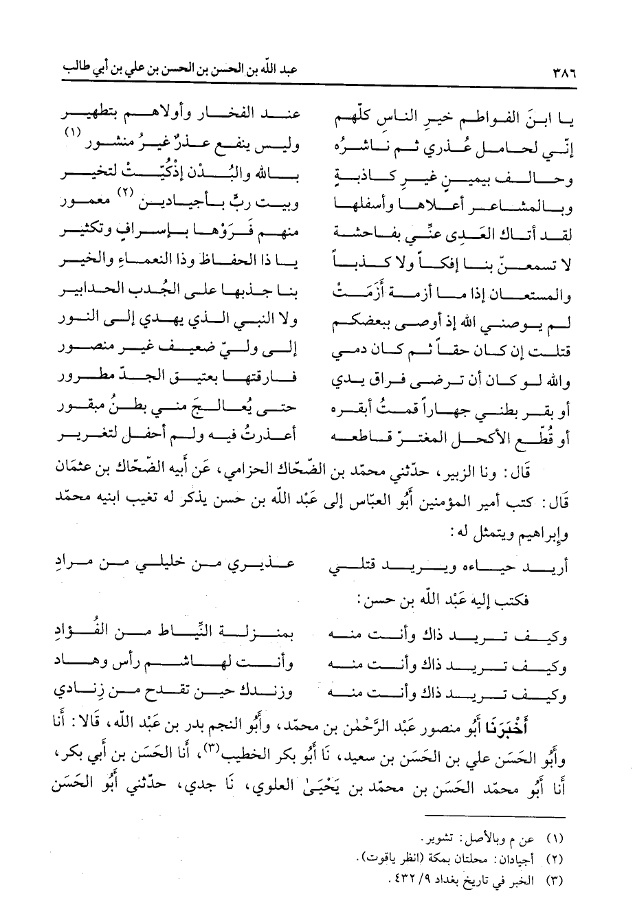 * يا ابن الفواطم خير الناس كلهم * عند الفخار وأولاهم بتطهير اني لحامل عذري ثم ناشره * وليس بنفع عذر غير منشور (1) وحالف بيمين غير كاذبة * بالله والبدن إذكيت لتخير وبالمشاعر أعلاها وأسفلها * وبيت رب باجيادين (2) معمور لقد اتاك العدى عني بفاحشة * منهم فروها بأسراف وتكثير لا تسمعن بنا إفكا ولا كذبا * يا ذا الحفاظ وذا النعماء والخير والمستعان إذا ما أزمة أزمت * بنا جذبها على الجدب الحدابير لم يوصني الله إذ أوصى ببعضكم * ولا النبي الذي يهدي إلى النور قتلت إن كان حقا ثم كان دمي * إلى ولي ضعيف غير منصور والله لو كان أن ترضى فراق يدي * فارقتها بعتيق الجد مطرور أو بقر بطني جهارا قمت ابقره * حتى يعالج مني بطن مبقور أو قطع الآكحل المغتر قاطعه * أعذرت فيه ولم احفل لتعرير * قال ونا الزبير حدثني محمد بن الضحاك الحزامي عن أبيه الضحاك بن عثمان قال كتب امير المؤمنين أبو العباس إلى عبد الله بن حسن يذكر له تغيب ابنيه محمد وإبراهيم ويتمثل له * اريد حياءه ويريد قتلي * عذيري من خليلي من مراد * فكتب إليه عبد الله بن حسن * وكيف تريد ذاك وانت منه * بمنزلة النياط من ألفؤاد وكيف تريد ذاك وانت منه * وانت لهاشم رأس وهاد وكيف تريد ذاك وانت منه * وزندك حين تقدح من زنادي * أخبرنا أبو منصور عبد الرحمن بن محمد وأبو النجم بدر بن عبد الله قالا أنا أبو الحسن علي بن الحسن بن سعيد نا أبو بكر الخطيب (3) أنا الحسن بن أبي بكر أنا أبو محمد الحسن بن محمد بن يحيى العلوي نا جدي حدثني أبو الحسن