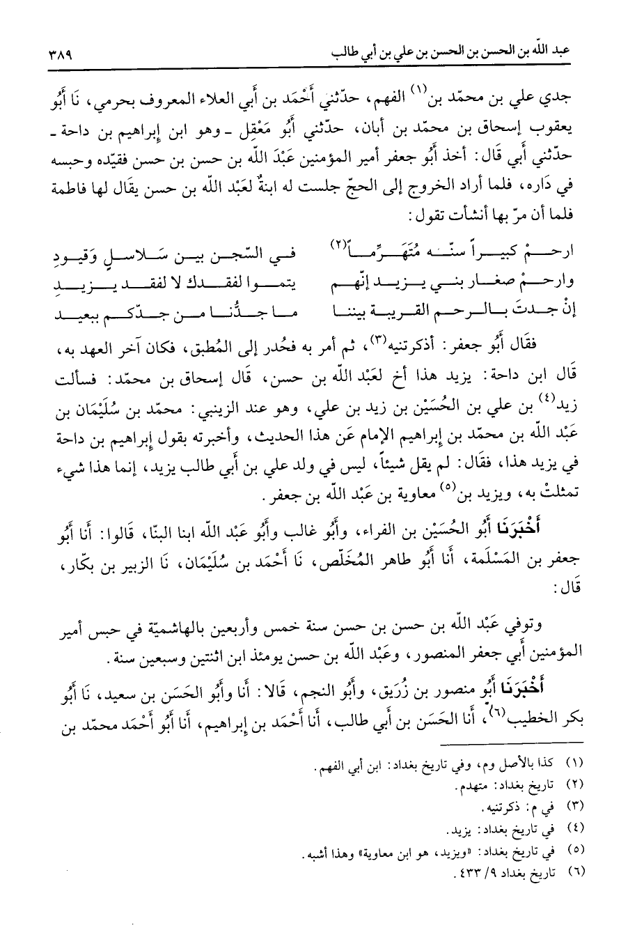 جدي علي بن محمد بن (1) الفهم حدثني أحمد بن أبي العلاء المعروف بحرمي نا أبو يعقوب اسحاق بن محمد بن أبان حدثني أبو معقل وهو ابن إبراهيم بن داحة حدثني أبي قال اخذ أبو جعفر امير المؤمنين عبد الله بن حسن بن حسن فقيده وحبسه في داره فلما أراد الخروج إلى الحج جلست له ابنة لعبد الله بن حسن يقال لها فاطمة فلما أن مر بها أنشأت تقول * أرحم كبيرا سنه متهرما (2) * في السجن بين سلاسل وقيود وارحم صغار بني يزيد إنهم * يتموا لفقدك لا لفقد يزيد إن جدت بالرحم القريبة بيننا * ماجدنا من جدكم ببعيد * فقال أبو جعفر أذكرتنيه (3) ثم أمر به فحدر إلى المطبق فكان آخر العهد به قال ابن داحة يزيد هذا أخ لعبد الله بن حسن قال اسحاق بن محمد فسألت زيد (4) بن علي بن الحسين بن زيد بن علي وهو عند الزينبي محمد بن سليمان بن عبد الله بن محمد بن إبراهيم الإمام عن هذا الحديث وأخبرته بقول إبراهيم بن داحة في يزيد هذا فقال لم يقل شيئا ليس في ولد علي بن أبي طالب يزيد إنما هذا شئ تمثلت به ويزيد بن (5) معاوية بن عبد الله بن جعفر أخبرنا أبو الحسين بن الفراء وأبو غالب وأبو عبد الله ابنا البنا قالوا أنا أبو جعفر بن المسلمة أنا أبو طاهر المخلص نا أحمد بن سليمان نا الزبير بن بكار قال وتوفي عبد الله بن حسن بن حسن سنة خمس وأربعين بالهاشمية في حبس امير المؤمنين أبي جعفر المنصور وعبد الله بن حسن يومئذ ابن اثنتين وسبعين سنة أخبرنا أبو منصور بن زريق وأبو النجم قالا أنا وأبو الحسن بن سعيد نا أبو بكر الخطيب (6) أنا الحسن بن أبي طالب أنا أحمد بن إبراهيم أنا أبو أحمد محمد بن
