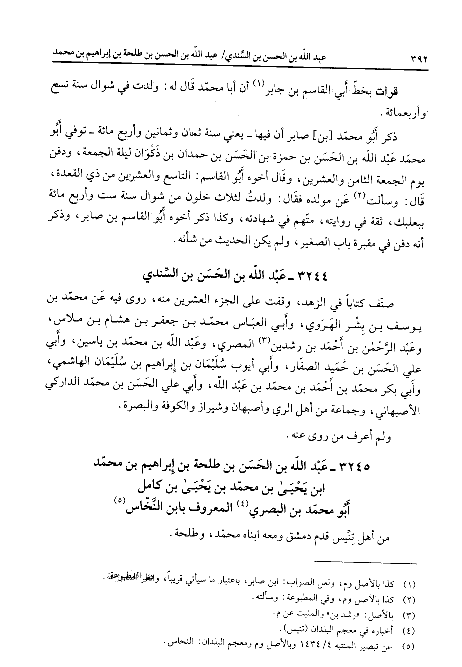 3244 - عبد الله بن الحسن بن السندي صنف كتأبا في الزهد وقفت على الجزء العشرين منه روى فيه عن محمد بن يوسف بن بشر الهروي وأبي العباس محمد بن جعفر بن هشام بن ملاس وعبد الرحمن بن أحمد بن رشدين (3) المصري وعبد الله بن محمد بن ياسين وأبي علي الحسن بن حميد الصفار وأبي أيوب سليمان بن إبراهيم بن سليمان الهاشمي وأبي بكر محمد بن أحمد بن محمد بن عبد الله وأبي علي الحسن بن محمد الداركي الأصبهاني وجماعة من أهل الري واصبهان وشيراز والكوفة والبصرة ولم أعرف من روى عنه