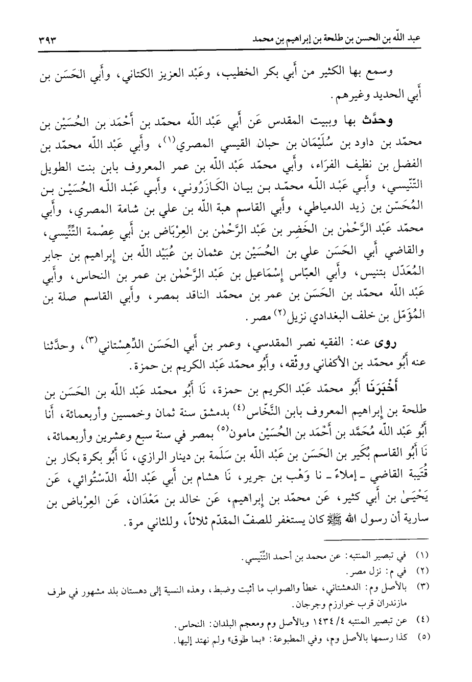 وسمع بها الكثير من أبي بكر الخطيب وعبد العزيز الكتاني وأبي الحسن بن أبي الحديد وغيرهم وحدث بها وببيت المقدس عن أبي عبد الله محمد بن أحمد بن الحسين بن محمد بن داود بن سليمان بن حبان القيسي المصري (1) وأبي عبد الله محمد بن الفضل بن نظيف الفراء وأبي محمد عبد الله بن عمر المعروف بابن بنت الطويل التنيسي وأبي عبد الله محمد بن بيان الكازروني وأبي عبد الله الحسين بن المحسن بن زيد الدمياطي وأبي القاسم هبة الله بن علي بن شامة المصري وأبي محمد عبد الرحمن بن الخضر بن عبد الرحمن بن العرباض بن أبي عصمة التنيسي والقاضي أبي الحسن علي بن الحسين بن عثمان بن عبيد الله بن إبراهيم بن جابر المعدل بتنيس وأبي العباس إسماعيل بن عبد الرحمن بن عمر بن النحاس وأبي عبد الله محمد بن الحسن بن عمر بن محمد الناقد بمصر وأبي القاسم صلة بن المؤمل بن خلف البغدادي نزيل (2) مصر روى عنه الفقيه نصر المقدسي وعمر بن أبي الحسن الدهستاني (3) وحدثنا عنه أبو محمد بن الأكفاني ووثقه وأبو محمد عبد الكريم بن حمزة أخبرنا أبو محمد عبد الكريم بن حمزة أنا أبو محمد عبد الله بن الحسن بن طلحة بن إبراهيم المعروف بابن النخاس (4) بدمشق سنة ثمان وخمسين واربعمائة أنا أبو عبد الله محمد بن أحمد بن الحسين مأمون (5) بمصر في سنة سبع وعشرين واربعمائة نا أبو القاسم بكير بن الحسن بن عبد الله بن سلمة بن دينار الرازي نا أبو بكرة بكار بن قتية القاضي إملاء نا وهب بن جرير نا هشام بن أبي عبد الله الدستوائي عن يحيى بن أبي كثير عن محمد بن إبراهيم عن خالد بن معدان عن العرباض بن سارية ان رسول الله (صلى الله عليه وسلم) كان يستغفر للصف المقدم ثلاثا وللثاني مرة