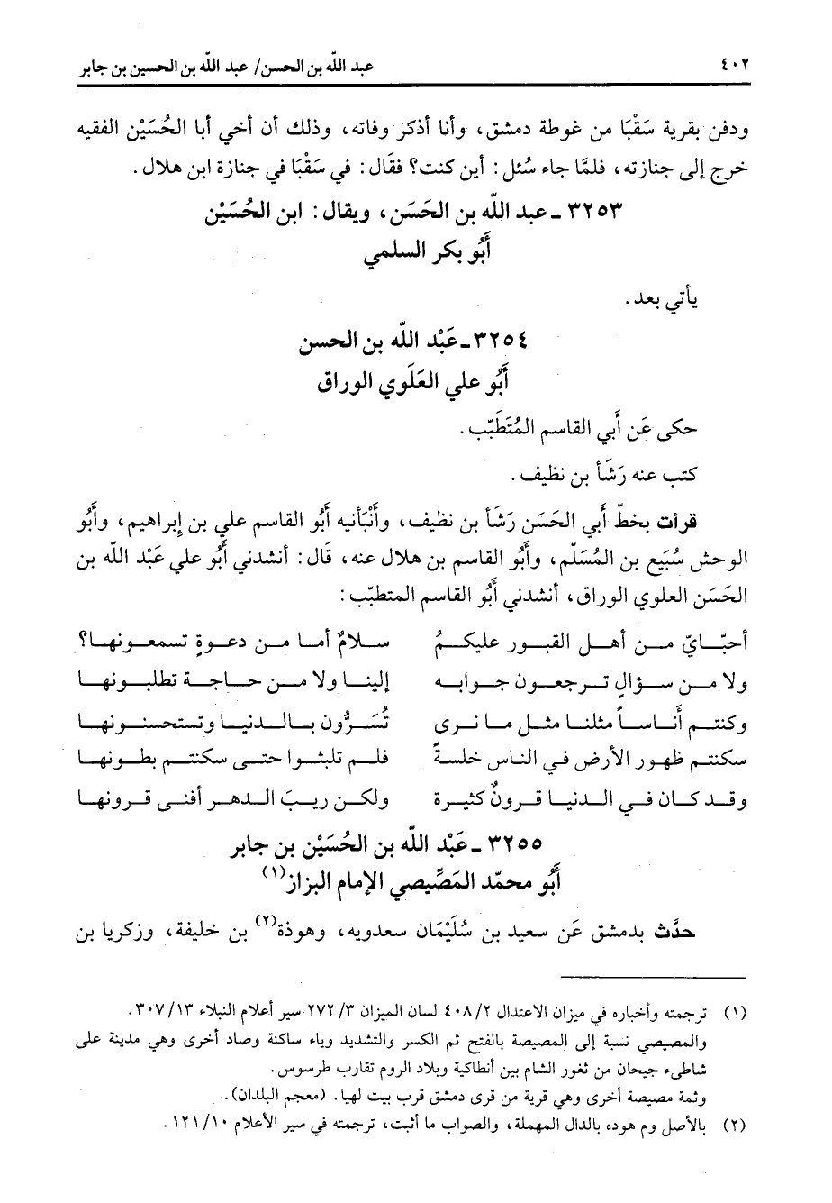3255 - عبد الله بن الحسين بن جابر أبو محمد المصيصي الأمام البزاز (1) حدث بدمشق عن سعيد بن سليمان سعدويه وهوذة (2) بن خليفة وزكريا بن