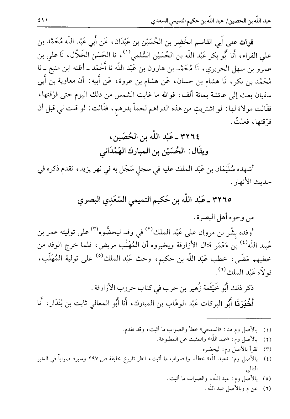 3265 - عبد الله بن حكيم التميمي السعدي البصري من وجوه أهل البصرة أوفده بشر بن مروان على عبد الملك (2) في وفد ليحضوه (3) على توليته عمر بن عبيد الله (4) بن معمر قتال الأزارقة ويخبروه أن المهلب مريض فلما خرج الوفد من خطبهم مضى خطب عبد الله بن حكيم وحث عبد الملك (5) على تولية المهلب فولاه عبد الملك (6) ذكر أبو خيثمة زهير بن حرب في كتاب حروب الأزارقة أخبرنا أبو البركات عبد الوهاب بن المبارك أنا أبو المعالي ثابت بن بندار أنا