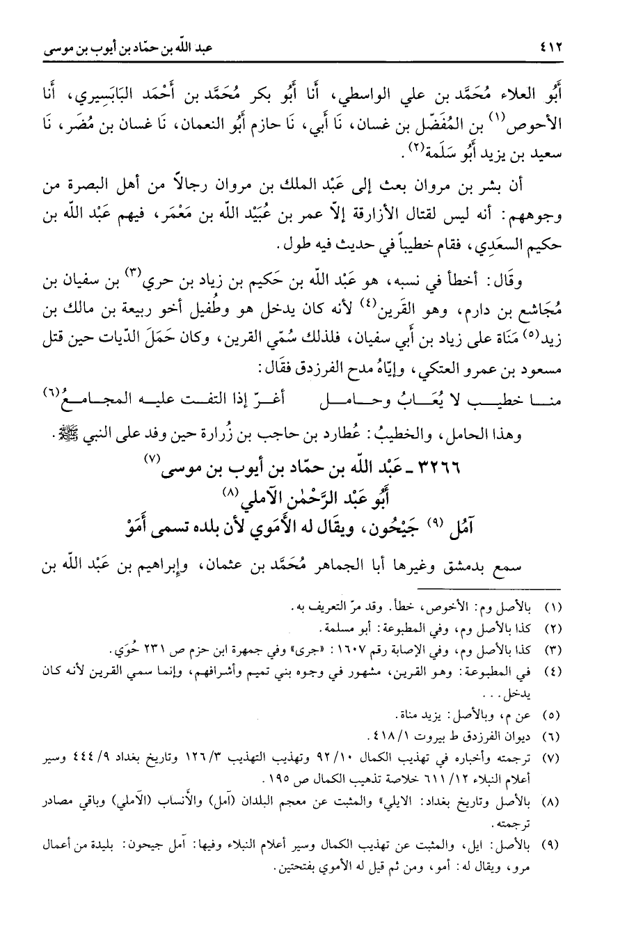 3266 - عبد الله بن حماد بن أيوب بن موسى (7) أبو عبد الرحمن الآملي (8) آمل (9) جيحون ويقال له الأموي لأن بلده تسمى أمو سمع بدمشق وغيرها أبا الجماهر محمد بن عثمان وإبراهيم بن عبد الله بن