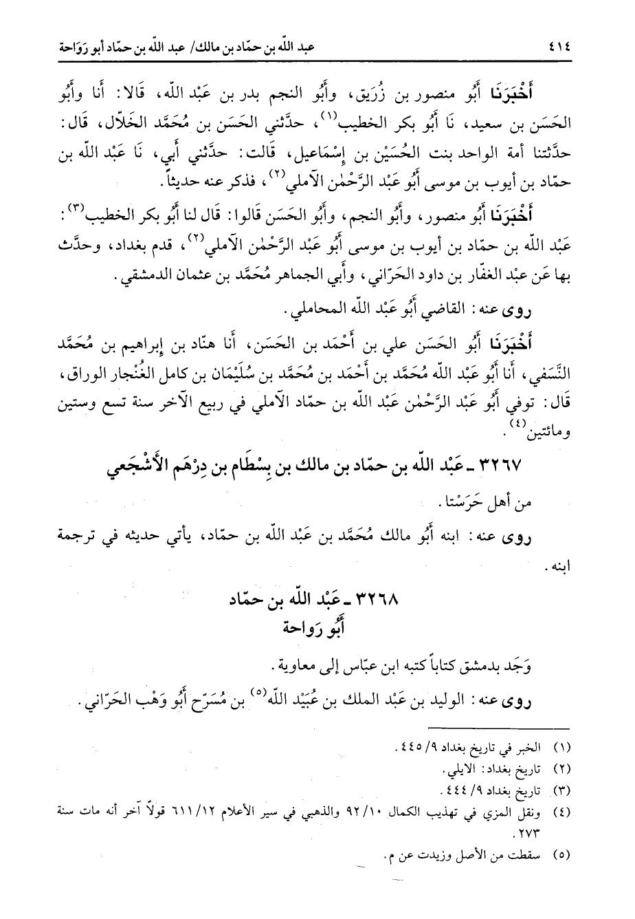 3268 - عبد الله بن حماد أبو رواحة وجد بدمشق كتأبا كتبه ابن عباس إلى معاوية روى عنه الوليد بن عبد الملك بن عبيد الله (5) بن مسرح أبو وهب الحراني