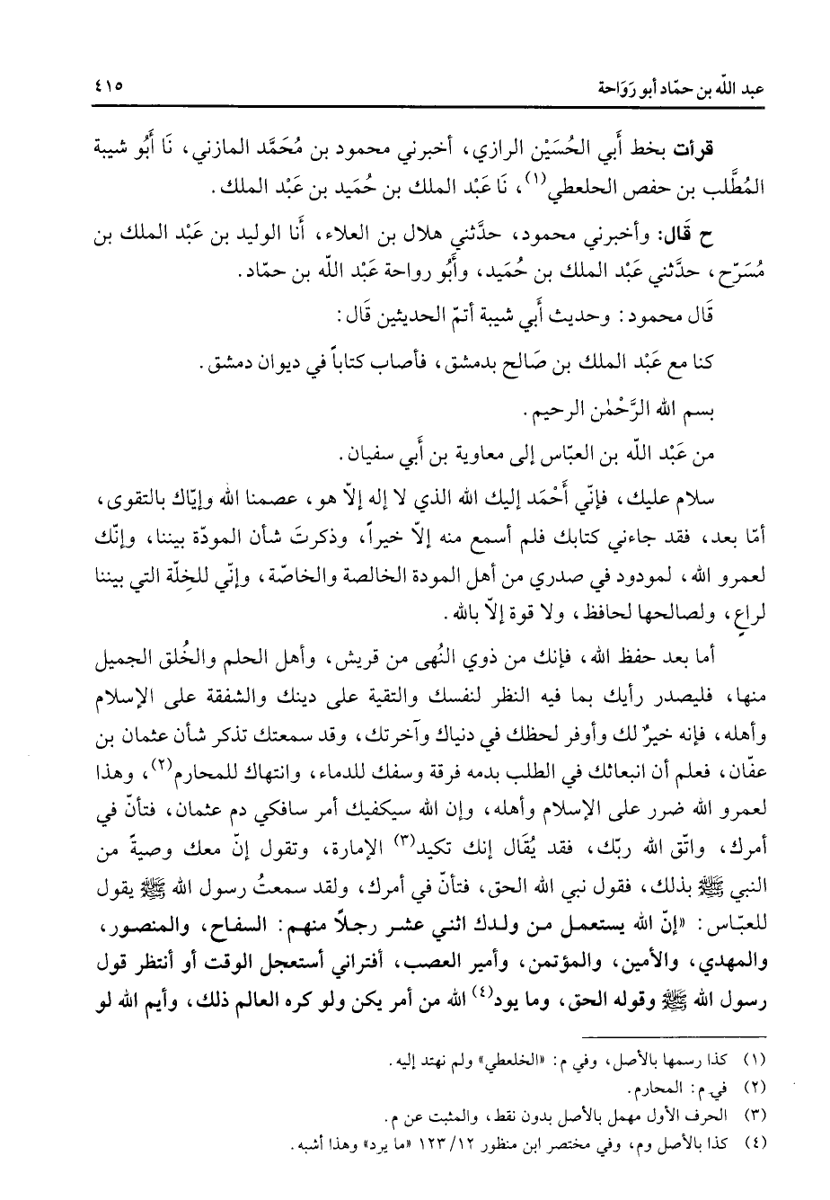 قرأت بخط أبي الحسين الرازي اخبرني محمود بن محمد المازني نا أبو شيبة المطلب بن حفص الحلعطي (1) نا عبد الملك بن حميد بن عبد الملك ح قال وأخبرني محمود حدثني هلال بن العلاء أنا الوليد بن عبد الملك بن مسرح حدثني عبد الملك بن حميد وأبو رواحة عبد الله بن حماد قال محمود وحديث أبي شيبة أتم الحديثين قال كنا مع عبد الملك بن صالح بدمشق فأصاب كتابا في ديوان دمشق بسم الله الرحمن الرحيم من عبد الله بن العباس إلى معاوية بن أبي سفيان سلام عليك فإني أحمد إليك الله الذي لا إله إلا هو عصمنا الله وإياك بالتقوى أما بعد فقد جاءني كتابك فلم أسمع منه إلا خيرا وذكرت شأن المودة بيننا وإنك لعمرو الله لمودود في صدري من أهل المودة الخالصة والخاصة وإني للخلة التي بيننا لراع ولصالحها لحافظ ولا قوة إلا بالله أما بعد حفظ الله فإنك ذوي النهى من قريش وأهل الحلم والخلق الجميل منها فليصدر رأيك بما فيه النظر لنفسك والتقية على دينك والشفقة على الإسلام وأهله فإنه خير لك وأوفر لحظك في دنياك وآخرتك وقد سمعتك تذكر شأن عثمان بن عفان فعلم أن أنبعاثك في الطلب بدمه فرقة وسفك للدماء وانتهاك للمحارم (2) وهذا لعمرو الله ضرر على الإسلام وأهله وإن الله سيكفيك أمر سافكي دم عثمان فتأن في أمرك واتق الله ربك فقد يقال أنك تكيد (3) الإمارة وتقول إن معك وصية من النبي (صلى الله عليه وسلم) بذلك فقول نبي الله الحق فتأن في أمرك ولقد سمعت رسول الله (صلى الله عليه وسلم) يقول للعباس إن الله يستعمل من ولدك اثني عشر رجلا منهم السفاح والمنصور والمهدي والأمين والمؤتمن وأمير العصب أفتراني أستعجل الوقت أو أنتظر قول رسول الله (صلى الله عليه وسلم) وقوله الحق وما يود (4) الله من أمر يكن ولو كره العالم ذلك وأيم الله لو