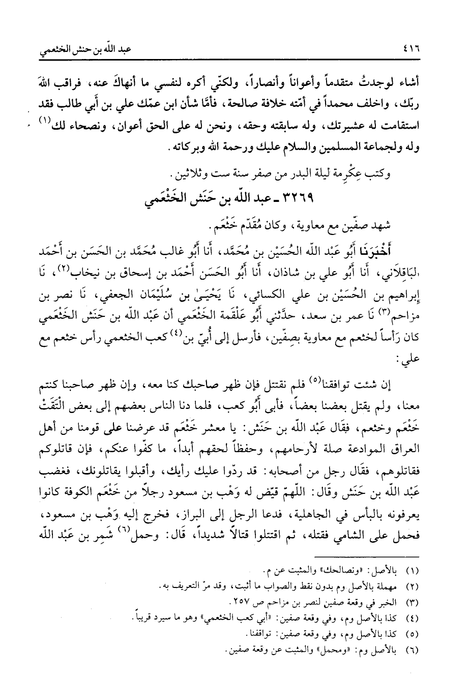 3269 - عبد الله بن حنش الخثعمي شهد صفين مع معاوية وكان مقدم خثعم أخبرنا أبو عبد الله الحسين بن محمد أنا أبو غالب محمد بن الحسن بن أحمد الباقلاني أنا أبو علي بن شاذان أنا أبو الحسن أحمد بن اسحاق بن نيخاب (2) نا إبراهيم بن الحسين بن علي الكسائي نا يحيى بن سليمان الجعفي نا نصر بن مزاحم (3) نا عمر بن سعد حدثني أبو علقمة الخثعمي أن عبد الله بن حنش الخثعمي كان رأسا لخثعم مع معاوية بصفين فأرسل الى أبي بن كعب الخثعمي رأس خثعم مع علي إن شئت توافقنا (5) فلم نقتتل فإن ظهر صاحبك كنا معه وإن ظهر صاحبنا كنتم معنا ولم يقتل بعضنا بعضا فأبى أبو كعب فلما دنا الناس بعضهم إلى بعض التقت خثعم وخثعم فقال عبد الله بن حنش يا معشر خثعم قد عرضنا على قومنا من أهل العراق الموادعة صلة لأرحامهم وحفظا لحقهم أبدا ما كفوا عنكم فإن قاتلوكم فقاتلوهم فقال رجل من أصحابه قد ردوا عليك رأيك وأقبلوا يقاتلونك فغضب عبد الله بن حنش وقال اللهم قيض له وهب بن مسعود رجلا من خثعم الكوفة كانوا يعرفونه بالبأس في الجاهلية فدعا الرجل إلى البراز فخرج إليه وهب بن مسعود فحمل على الشامي فقتله ثم اقتتلوا قتالا شديدا قال وحمل (6) شمر بن عبد الله