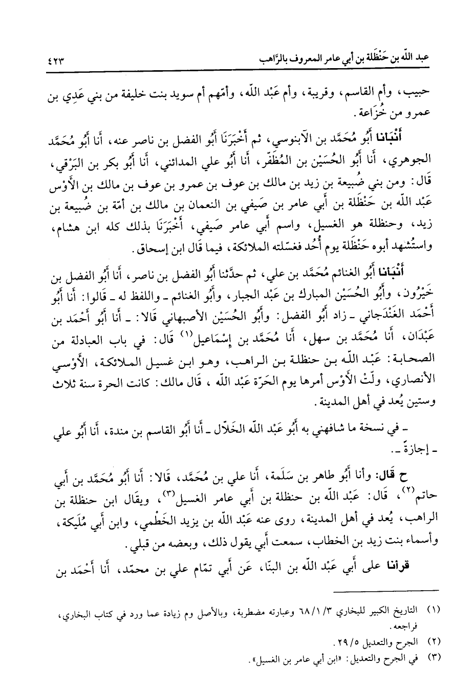 حبيب وأم القاسم وقريبة وأم عبد الله وأمهم أم سويد بنت خليفة من بني عدي بن عمرو من خزاعة أنبأنا أبو محمد بن الآبنوسي ثم أخبرنا أبو الفضل بن ناصر عنه أنا أبو محمد الجوهري أنا أبو الحسين بن المظفر أنا أبو علي المدائني أنا أبو بكر بن البرقي قال ومن بني ضبيعة بن زيد بن مالك بن عوف بن عمرو بن عوف بن مالك بن الأوس عبد الله بن حنظلة بن أبي عامر بن صيفي بن النعمان بن مالك بن أمه بن ضبيعة بن زيد وحنظلة هو الغسيل واسم أبي عامر صيفي أخبرنا بذلك كله ابن هشام واستشهد ابوه حنظلة يوم أحد فغسلته الملائكة فيما قال ابن اسحاق انبأنا أبو الغنائم محمد بن علي ثم حدثنا أبو الفضل بن ناصر أنا أبو الفضل بن خيرون وأبو الحسين المبارك بن عبد الجبار وأبو الغنائم واللفظ له قالوا أنا أبو أحمد الغندجاني زاد أبو الفضل وأبو الحسين الأصبهاني قالا أنا أبو أحمد بن عبدان أنا محمد بن سهل أنا محمد بن إسماعيل (1) قال في باب العبادلة من الصحابة عبد الله بن حنظلة بن الراهب وهو ابن غسيل الملائكة الأوسي الأنصاري ولت الأوس أمرها يوم الحرة عبد الله قال مالك كانت الحرة سنة ثلاث وستين يعد في أهل المدينة في نسخة ماشافهني به أبو عبد الله الخلال أنا أبو القاسم بن مندة أنا أبو علي إجازه ح قال وأنا أبو طاهر بن سلمة أنا علي بن محمد قالا أنا أبو محمد بن أبي حاتم (2) قال عبد الله بن حنظلة بن أبي عامر الغسيل (3) ويقال ابن حنظلة بن الراهب يعد في أهل المدينة روى عنه عبد الله بن يزيد الخطمي وابن أبي مليكة واسماء بنت زيد بن الخطاب سمعت أبي يقول ذلك وبعضه من قبلي قرأنا على أبي عبد الله بن البنا عن أبي تمام علي بن محمد أنا أحمد بن