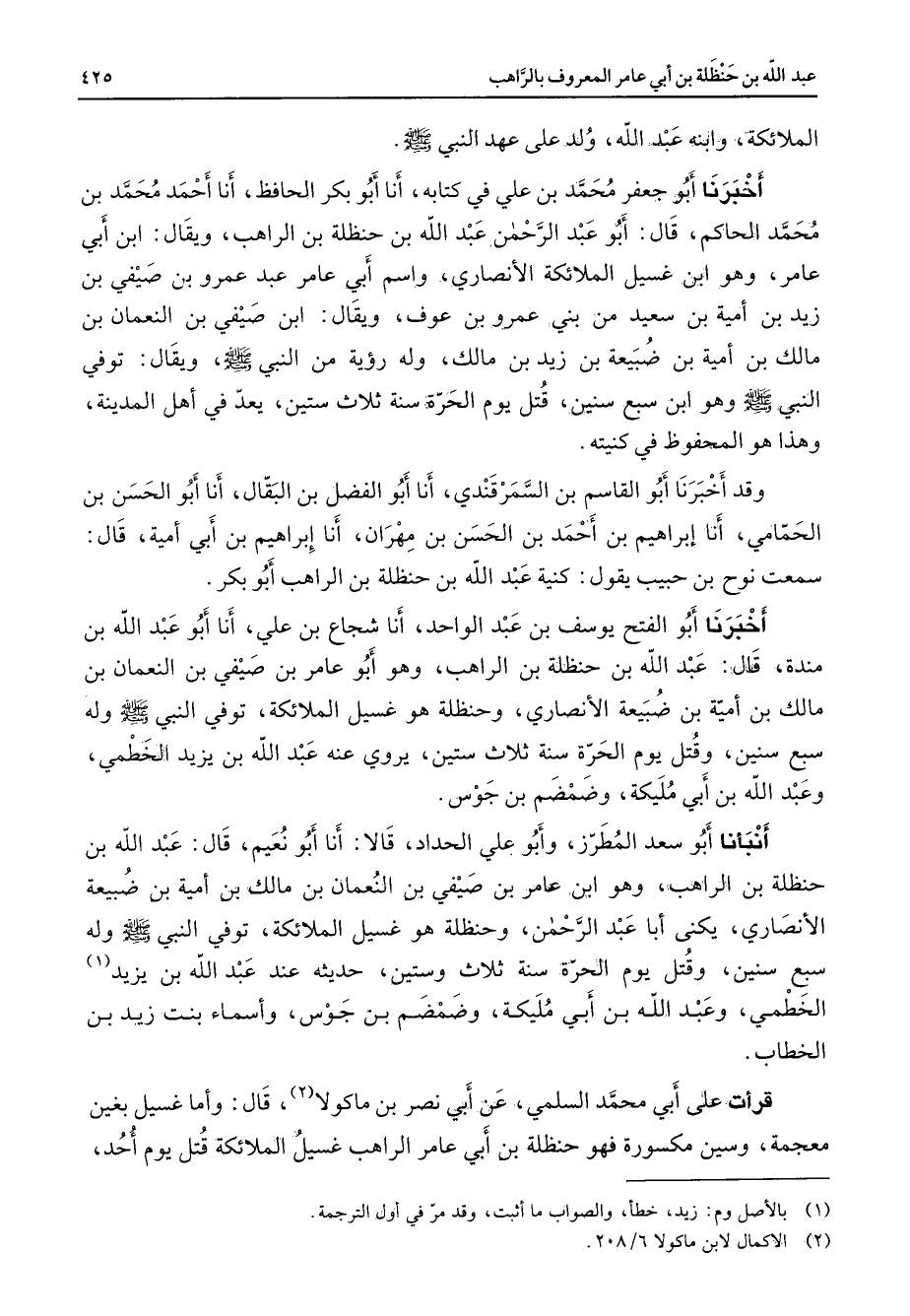 الملائكة وابنه عبد الله ولد على عهد النبي (صلى الله عليه وسلم) أخبرنا أبو جعفر محمد بن علي في كتابه أنا أبو بكر الحافظ أنا أحمد محمد بن محمد الحاكم قال أبو عبد الرحمن عبد الله بن حنظلة بن الراهب ويقال ابن أبي عامر وهو ابن غسيل الملائكة الأنصاري واسم أبي عامر عبد عمرو بن صيفي بن زيد بن أميه بن سعيد من بني عمرو بن عوف ويقال ابن صيفي بن النعمان بن مالك بن اميه بن ضبيعة بن زيد بن مالك وله رؤية من النبي (صلى الله عليه وسلم) ويقال توفي النبي (صلى الله عليه وسلم) وهو ابن سبع سنين قتل يوم الحرة سنة ثلاث ستين يعد في أهل المدينة وهذا هو المحفوظ في كنيته وقد أخبرنا أبو القاسم بن السمرقندي أنا أبو الفضل بن البقال أنا أبو الحسن بن الحمامي أنا إبراهيم بن أحمد بن الحسن بن مهران أنا إبراهيم بن أبي امية قال سمعت نوح بن حبيب يقول كنية عبد الله بن حنظلة بن الراهب أبو بكر أخبرنا أبو الفتح يوسف بن عبد الواحد أنا شجاع بن علي أنا أبو عبد الله بن مندة قال عبد الله بن حنظلة بن الراهب وهو أبو عامر بن صيفي بن النعمان بن مالك بن أمية بن ضبيعة الأنصاري وحنظلة هو غسيل الملائكة توفي النبي (صلى الله عليه وسلم) وله سبع سنين وقتل يوم الحرة سنة ثلاث وستين يروي عنه عبد الله بن يزيد الخطمي وعبد الله بن أبي مليكة وضمضم بن جوس انبأنا أبو سعد المطرز وأبو علي الحداد قالا أنا أبو نعيم قال عبد الله بن حنظلة بن الراهب وهو ابن عامر بن صيفي بن النعمان بن مالك بن امية بن ضبيعة الأنصاري يكنى أبا عبد الرحمن وحنظلة هو غسيل الملائكة توفي النبي (صلى الله عليه وسلم) وله سبع سنين وقتل يوم الحرة سنة ثلاث وستين حديثه عند عبد الله بن يزيد (1) الخطمي وعبد الله بن أبي مليكة وضمضم بن حوس وأسماء بنت زيد بن الخطاب قرأت على أبي محمد السلمي عن ابي نصر بن ماكولا (2) قال وأما غسيل بغين معجمة وسين مكسورة فهو حنظلة بن أبي عامر الراهب غسيل الملائكة قتل يوم أحد