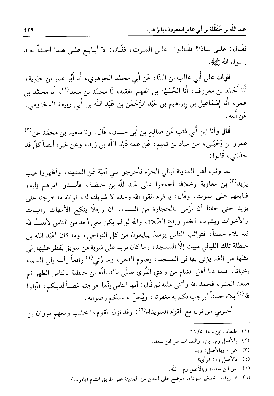 فقال على ماذا فقالوا على الموت فقال لا أبايع على هذا أحدا بعد رسول الله (صلى الله عليه وسلم) قرأت على أبي غالب بن البنا عن أبي محمد الجوهري أنا أبو عمر بن حيوية أنا أحمد بن معروف أنا الحسين بن الفهم الفقيه أنا محمد بن سعد (1) أنا محمد بن عمر أنا إسماعيل بن إبراهيم بن عبد الرحمن بن عبد الله بن أبي ربيعة المخزومي عن أبيه قال وأنا ابن أبي ذئب عن صالح بن أبي حسان قال ونا سعيد بن محمد عن (2) عمرو بن يحيى عن عباد بن تميم عن عمه عبد الله بن زيد وعن غيره أيضا كل قد حدثني قالوا لما وثب أهل المدينة ليالي الحرة فأخرجو بني أمية عن المدينة وأظهروا عيب يزيد (3) بن معاوية وخلافه اجمعوا على عبد الله بن حنظلة فأسندوا امرهم إليه فبايعهم على الموت وقال يا قوم اتقوا الله وحده لا شريك له فوالله ما خرجنا على يزيد حتى خفنا ان نرمى بالحجارة من السماء ان رجلا ينكح الأمهات والبنات والأخوات ويشرب الخمر ويدع الصلاة والله لو لم يكن معي أحد من الناس لابليت لله فيه بلاء حسنا فتواثب الناس يومئذ يبايعون من كل النواحي وما كان لعبد الله بن حنظلة تلك الليالي مبيت الا المسجد وما كان يزيد على شربة من سويق يفطر عليها إلى مثلها من الغد يؤتى بها في المسجد يصوم الدهر وما رئى (4) رافعا رأسه إلى السماء إخباتا فلما دنا أهل الشام من وادي القرى صلى عبد الله بن حنظلة بالناس الظهر ثم صعد المنبر فحمد الله وأثنى عليه ثم قال ايها الناس إنما خرجتم غضبا لدينكم فأبلوا لله (5) بلاء حسنا ليوجب لكم به مغفرته ويحل به عليكم رصوانه اخبرني من نزل مع القوم السويداء (6) وقد نزل القوم ذا خشب ومعهم مروان بن