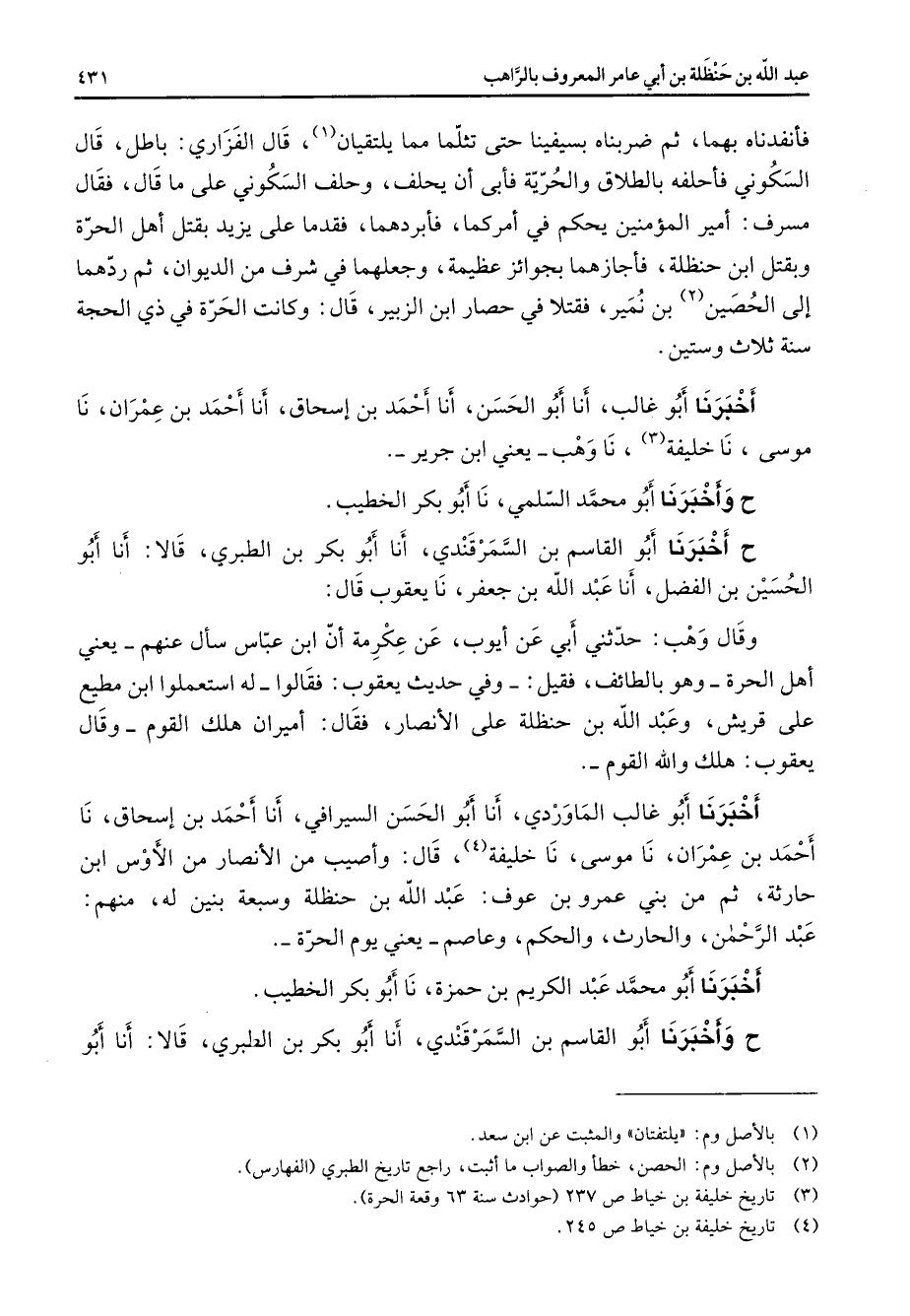 فانفدناه بهما ثم ضربناه بسيفينا حتى تثلما مما يلتقيان (1) قال الفزاري باطل قال السكوني فأحلفه بالطلاق والحرية فأبى أن يحلف وحلف السكوني على ما قال فقال مسرف امير المؤمنين يحكم في أمركما فأبردهما فقدما على يزيد بقتل أهل الحرة وبقتل ابن حنظلة فأجازهما بجوائز عظيمة وجعلهما في شرف من الديوان ثم ردهما إلى الحصين (2) بن نمير فقتلا في حصار ابن الزبير قال وكانت الحرة في ذي الحجة سنة ثلاث وستين أخبرنا أبو غالب أنا أبو الحسن أنا أحمد بن اسحاق أنا أحمد بن عمران نا موسى نا خليفة (3) نا وهب يعني ابن جرير ح وأخبرنا أبو محمد السلمي نا أبو بكر الخطيب ح أخبرنا أبو القاسم بن السمرقندي أنا أبو بكر بن الطبري قالا أنا أبو الحسين بن الفضل أنا عبد الله بن جعفر نا يعقوب قال وقال وهب حدثني أبي عن أيوب عن عكرمة ان ابن عباس سأل عنهم يعني أهل الحرة وهو بالطائف فقيل وفي حديث يعقوب فقالوا له استعملوا ابن مطيع على قريش وعبد الله بن حنظلة على الآنصار فقال اميران هلك القوم وقال يعقوب هلك والله القوم أخبرنا أبو غالب الماوردي أنا أبو الحسن السيرافي أنا أحمد بن اسحاق نا