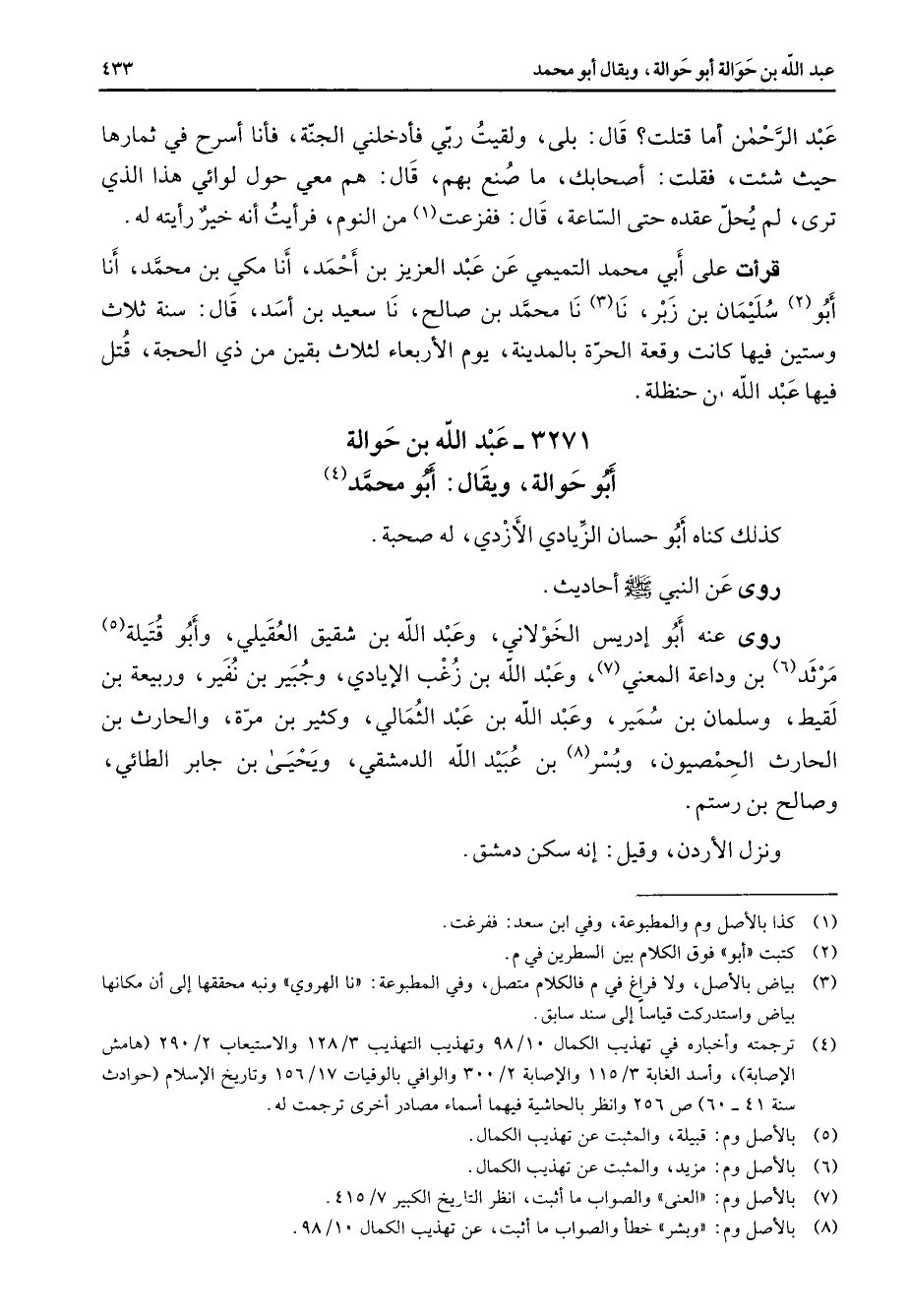 3271 - عبد الله بن حوالة أبو حوالة ويقال أبو محمد (4) كذلك كناه أبو حسان الزيادي الازدي له صحبة روى عن النبي (صلى الله عليه وسلم) أحاديث روى عنه أبو إدريس الخولاني وعبد الله بن شقيق العقيلي وأبو قتيلة (5) مرثد (6) بن وداعة المعني (7) وعبد الله بن زغب الإيادي وجبير بن نفير وربيعة بن لقيط وسلمان بن سمير وعبد الله بن عبد الثمالي وكثير بن مرة والحارث بن الحارث الحمصيون وبسر (8) بن عبيد الله الدمشقي ويحيى بن جابر الطائي وصالح بن رستم ونزل الآردن وقيل إنه سكن دمشق