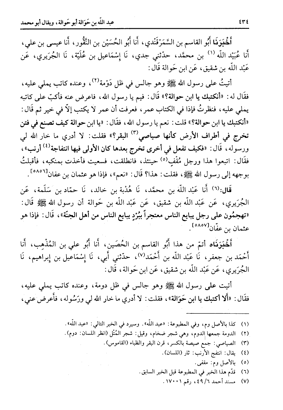 [5857] أخبرناه أتم من هذا أبو القاسم بن الحصين أنا أبو علي بن المذهب أنا أحمد بن جعفر نا عبد الله بن أحمد (7) حدثني أبي نا إسماعيل بن إبراهيم نا الجريري عن عبد الله بن شقيق عن ابن حوالة قال اتيت على رسول الله (صلى الله عليه وسلم) وهو جالس في ظل دومة وعنده كاتب يملي عليه فقال ألا أكتبك يا ابن حوالة فقلت لا ادري ما خار الله لي ورسوله فأعرض عني