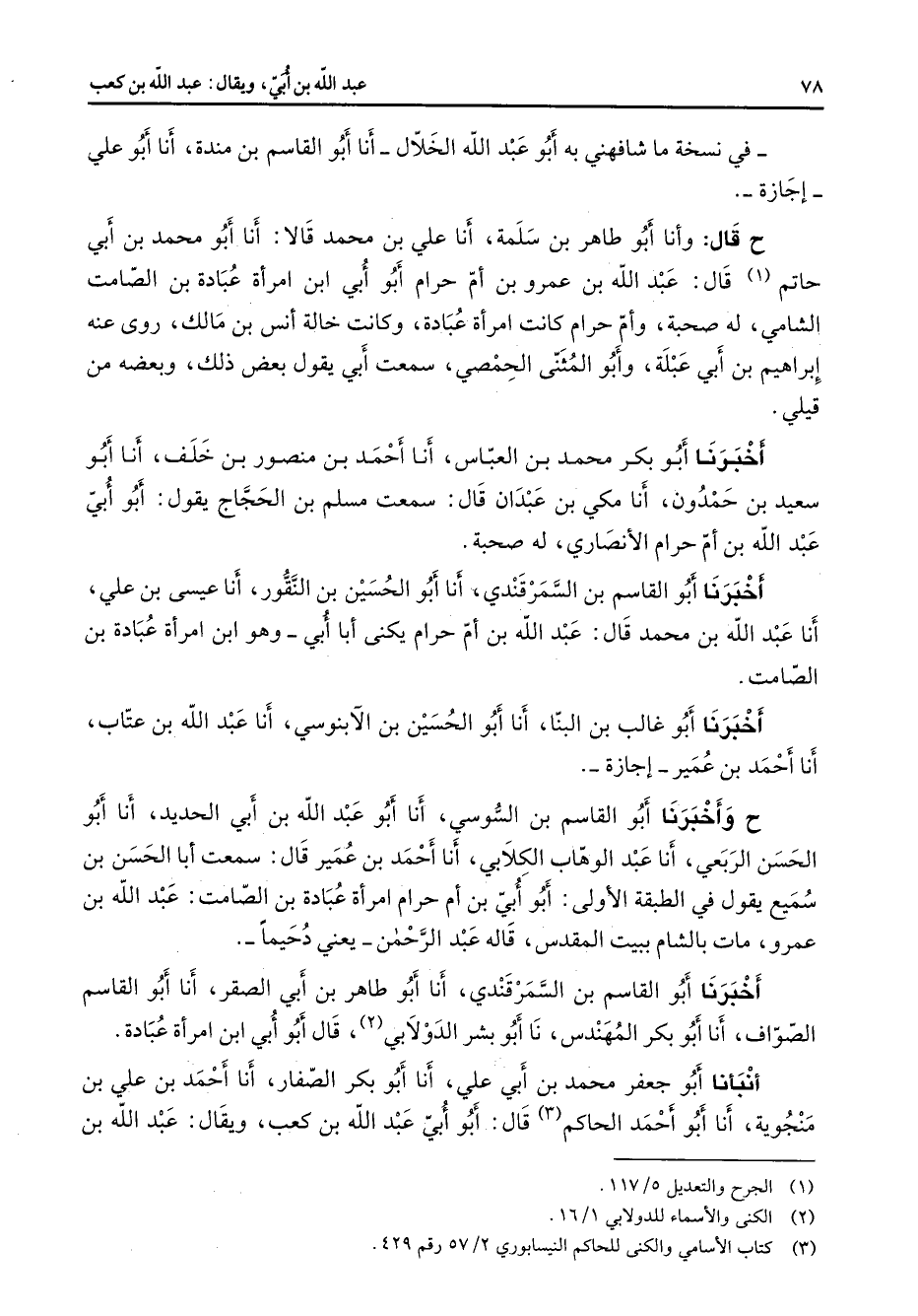 في نسخة ماشافهني به أبو عبد الله الخلال أنا أبو القاسم بن مندة أنا أبو علي إجازة ح قاوأنا أبو طاهر بن سلمة أنا علي بن محمد قالا أنا أبو محمد بن أبي حاتم (1) قال عبد الله بن عمرو بن أم حرام أبو أبي ابن امرأة عبادة بن الصامت الشامي له صحبة وأم حرام كانت امرأة عبادة وكانت خالة انس بن مالك روى عنه إبراهيم بن أبي عبلوأبو المثنى الحمصي سمعت أبي يقول بعض ذلك وبعضه من قيلي أخبرنا أبو بكر محمد بن العباس أنا أحمد بن منصور بن خلف أنا أبو سعيد بن حمدون أنا مكي بن عبدان قال سمعت مسلم بن الحجاج يقول أبو أبي عبد الله بن أم حرام الأنصاري له صحبة أخبرنا أبو القاسم بن السمرقندي أنا أبو الحسين بن النقور أنا عيسى بن على أنا عبد الله بن محمد قال عبد الله بن أم حرام يكنى أبا أبي وهو ابن امرأة عبادة بن الصامت أخبرنا أبو غالب بن البنا أنا أبو الحسين بن الآبنوسي أنا عبد الله بن عتاب أنا أحمد بن عمير إجازة ح وأخبرنا أبو القاسم بن السوسي أنا أبو عبد الله بن أبي الحديد أنا أبو الحسن الربعي أنا عبد الوهاب الكلابي أنا أحمد بن عمير قال سمعت أبا الحسن بن سميع يقول في الطبقة الأولى أبو أبي بن ام حرام امرأة عبادة بن الصامت عبد الله بن عمرو مات بالشام ببيت المقدس قال عبد الرحمن يعني دحيما أخبرنا أبو القاسم بن السمرقندي أنا أبو طاهر بن أبي الصقر أنا أبو القاسم الصواف أنا أبو بكر المهندس نا أبو بشر الدولابي (2) قال أبو أبي ابن امرأة عبادة أنبأنا أبو جعفر محمد بن أبي علي أنا أبو بكر الصفار أنا أحمد بن علي بن منجوية أنا أبو أحمد الحاكم (3) قال أبو أبي عبد الله بن كعب ويقال عبد الله بن
