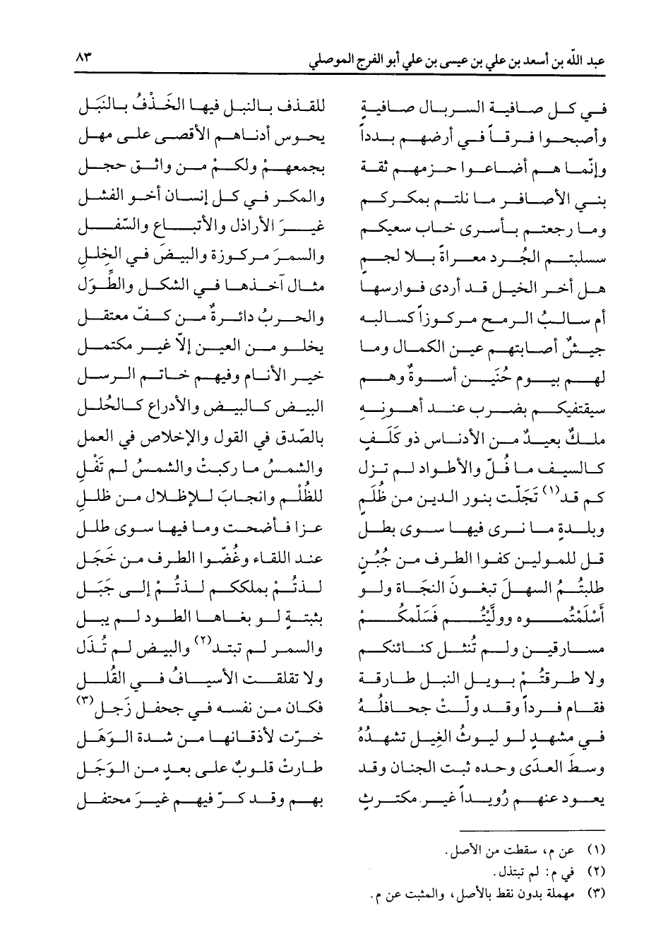 في كل صافية السربال صافية * للقذف بالنبل فيها الخذف بالنبل وأصبحوا فرقا في أرضهم بددا * يحوس أدناهم الأقصى على مهل وإنما هم أضاعوا حزمهم ثقة * بجمعهم ولكم من واثق حجل بني الأصافر ما نلتم بمكركم * والمكر في كل إنسان أخو الفشل وما رجعتم بأسرى خاب سعيكم * غير الأراذل والأتباع والسفل سسلبتم الجرد معراة بلا لجم * والسمر مركوزة والبيض في الخلل هل أخر الخيل قد أردى فوارسها * مثال آخذها في الشكل والطول أم سالب الرمح مركوزا كسالبه * والحرب دائرة من كف معتقل جيش أصابتهم عين الكمال وما * يخلو من العين إلا غير مكتمل لهم بيوم حنين أسوة وهم * خير الأنام وفيهم خاتم الرسل سيقتفيكم بضرب عند أهونه * البيض كالبيض والأدراع كالحلل ملك بعيد من الأدناس ذو كلف * بالصدق في القول والإخلاص في العمل كالسيف ما فل والأطواد لم تزل * والشمس ما ركبت والشمس لم تفل كم قد (1) تجلت بنور الدين من ظلم * للظلم وانجاب للإظلال من ظلل وبلدة ما نرى فيها سوى بطل * عزا فأضحت وما فيها سوى طلل قل للمولين كفوا الطرف من جبن * عند اللقاء وغضوا الطرف من خجل طلبتم السهل تبغون النجاة ولو * لذتم بملككم لذتم إلى جبل أسلمتموه ووليتم فسلمكم * بثبتة لو بغاها الطود لم يبل مسارقين ولم تنثل كنائنكم * والسمر لم تبتد (2) والبيض لم تذل ولا طرقتم بويل النبل طارقة * ولا تقلقت الأسياف في القلل فقام فردا وقد ولت جحافله * فكان من نفسه في جحفل زجل (3) في مشهد لو ليوث الغيل تشهده * خرت لأذقانها من شدة الوهل وسط العدى وحده ثبت الجنان وقد * طارت قلوب على بعد من الوجل يعود عنهم رويدا غير مكترث * بهم وقد كر فيهم غير محتفل