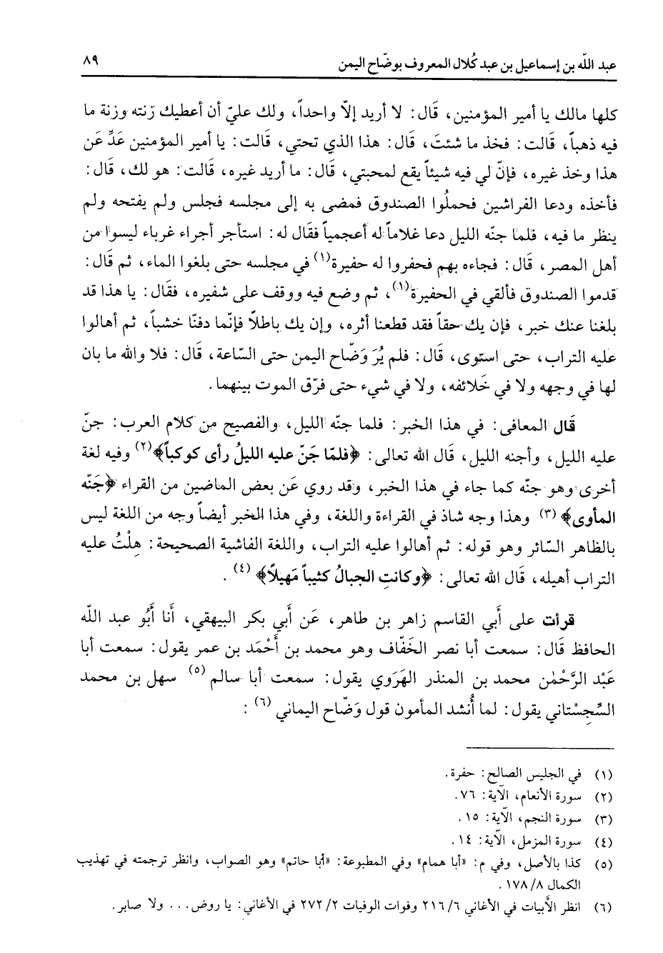 كلها مالك يا امير المؤمنين قال لا اريد إلا واحدا ولك على أن اعطيك زنته وزنه ما فيه ذهبا قالت فخذ ما شئت قال هذا الذي تحتي قالت يا امير المؤمنين عد عن هذا وخذ غيره فإن لي فيه شيئا يقع لمحبتي قال ما اريد غيره قالت هو لك قال فأخذه ودعا الفراشين فحملوا الصندوق فمضى به إلى مجلسه فجلس ولم يفتحه ولم ينظر ما فيه فلما جنه الليل دعا غلاما له اعجميا فقال له استأجر أجراء غرباء ليسوا من أهل المصر قال فجاءه بهم فحفروا له حفيرة (1) في مجلسه حتى بلغوا الماء ثم قال قدموا الصندوق فالقي في الحفيرة (1) ثم وضع فيه ووقف على شفيره فقال يا هذا قد بلغنا عنك خبر فان يكن حقا فقد قطعنا اثره وان يك باطلا فإنما دفنا خشبا ثم أهالوا عليه التراب حتى استوى قال فلم ير وضاح اليمن حتى الساعة قال فلا والله ما بان لها في وجهه ولا في خلائفة ولا في شئ حتى فرق الموت بينهما قال المعافى في هذا الخبر فلما جنه الليل والفصيح في كلام العرب جن عليه الليل وأجنه الليل قال الله تعإلى " فلما جن عليه الليل رأى كوكبا " (2) وفيه لغة أخرى وهو جنه كما جاء في هذا الخبروقد روي عن بعض الماضين من القراء " جنة المأوى " (3) وهذا وجه شاذ في القراءة واللغة وفي هذا الخبر ايضا وجه من اللغة ليس بالظاهر السائر وهو قوله ثم أهالوا عليه التراب واللغة الفاشية الصحيحة هلت عليه التراب أهيله قال الله تعالى " وكانت الجبال كثيبا مهيلا " (4) قرأت على أبي القاسم زاهر بن طاهر عن أبي بكر البيهقي أنا أبو عبد الله الحافظ قال سمعت أبا نصر الخفاف وهو محمد بن أحمد بن عمر يقول سمعت أبا عبد الرحمن محمد بن المنذر الهروي يقول سمعت أبا سالم (5) سهل بن محمد السجستاني يقول لما انشد المأمون قول وضاح اليماني (6)