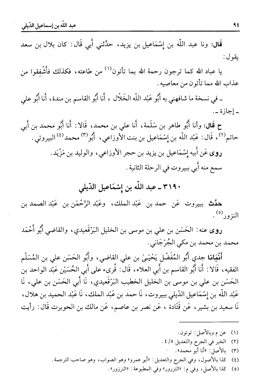 قال ونا عبد الله بن إسماعيل بن يزيد حدثني أبي قال كان بلال بن سعد يقول يا عباد الله كما ترجون رحمة الله بماتأتون (1) من طاعته فكذلك فأشفقوا من عذاب الله مما تأتون من معاصيه في نسخة مشافهني به أبو عبد الله الخلال أنا أبو القاسم بن مندة أنا أبو علي إجازة قال وأنا أبو طاهر بن سلمة أنا علي بن محمد قالا أنا أبو محمد بن أبي حاتم (2) قال عبد الله بن إسماعيل بن بنت الأوزاعي أبو (3) محمد (4) البيروتي روى عن أبيه إسماعيل بن يزيد بن حجر الأوزاعي والوليد بن مزيد سمع منه أبي ببيروت في الرحلة الثانية