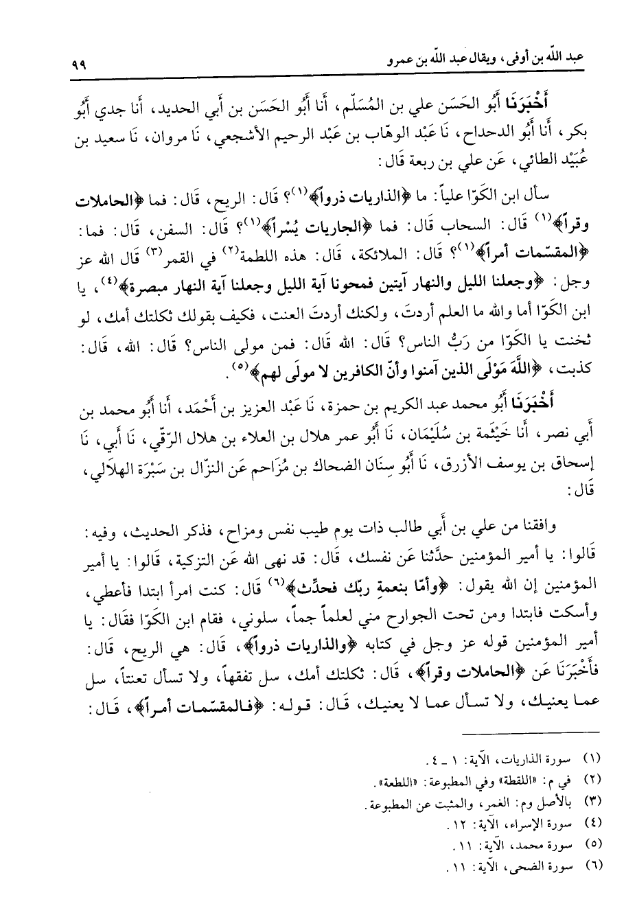 أخبرنا أبو الحسن علي بن المسلم أنا أبو الحسن بن أبي الحديد أنا جدي أبو بكر أنا أبو الدحداح نا عبد الوهاب بن عبد الرحيم الأشجعي نا مروان نا سعيد بن عبيد الطائي عن علي بن ربعة قال سأل ابن الكوا عليا ما " الذاريا ت ذروا " (1) قال الريح قال فما " الحاملات وقرا " (1) قال السحاب قال فما " الجاريا ت يسرا " (1) قال السفن قال فما " المقسمات أمرا " (1) قال الملائكة قال هذه اللطمة (2) في القمر (3) قال الله عز وجل " وجعلنا الليل والنهار آيتين فمحونا آية الليل وجعلنا آية النهار مبصرة " (4) يا ابن الكوا أما والله ما العلم اردت ولكنك أردت العنت فكيف بقولك ثكلتك أمك لو ثخنت يا الكوا من رب الناس قال الله قال فممولى الناس قال الله قال كذبت " الله مولى الذين آمنوا وأن الكافرين لا مولى لهم " (5) أخبرنا أبو محمد عبد الكريم بن حمزة نا عبد العزيز بن أحمد أنا أبو محمد بن أبي نصر أناخيثمة بن سليمان نا أبو عمر هلال بن العلاء بن هلال الرقي نا أبي نا إسحاق بن يوسف الأزرق نا أبو سنان الضحاك بن مزاحم عن النزال بن سبرة الهلالي قال وافقنا من علي بن أبي طالب ذات يوم طيب نفس ومزاح فذكر الحديث وفيه قالوا يا أمير المؤمنين حدثنا عن نفسك قال قد نهى الله عن التزكية قالوا يا أمير المؤمنين إن الله يقول " وأما بنعمة ربك فحدث " (6) قال كنت امرأ ابتدا فأعطي وأسكت فابتدا ومن تحت الجوارح مني لعلما جما سلوني فقام ابن الكوا فقال يا أمير المؤمنين قوله عز وجل في كتابه " والذاريات ذروا " قال هي الريح قال فأخبرناعن " الحاملات وقرا " قال ثكلتك أمك سل تفقها ولا تسأل تعنتا سل عما يعنيك ولا تسأل عما لا يعنيك قال قوله " فالمقسمات أمرا " قال