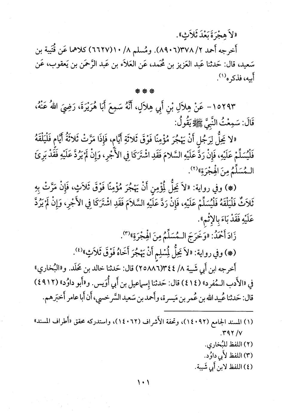 - وفي رواية: «لا يحل لمؤمن أن يهجر مؤمنا فوق ثلاث، فإن مرت به ثلاث فليلقه فليسلم عليه، فإن رد عليه السلام فقد اشتركا في الأجر، وإن لم يرد عليه فقد باء بالإثم».