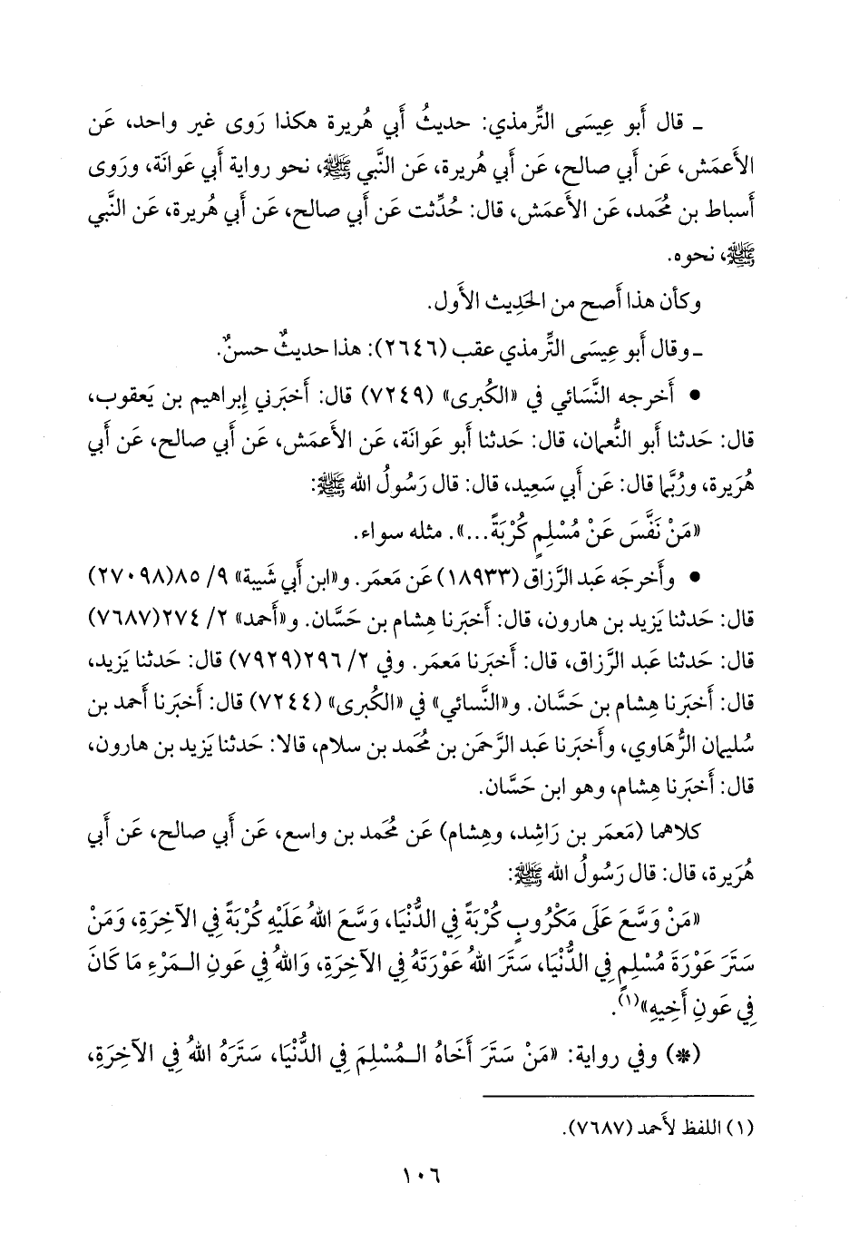 ـ قال التِّرمِذي: حديث أبي هريرة هكذا روى غير واحد، عن الأعمش، عن أبي صالح، عن أبي هريرة، عن النبي صَلى الله عَليه وسَلم نحو رواية أبي عَوانة، وروى أسباط بن محمد، عن الأعمش، قال: حدثت عن أبي صالح، عن أبي هريرة، عن النبي صَلى الله عَليه وسَلم نحوه.