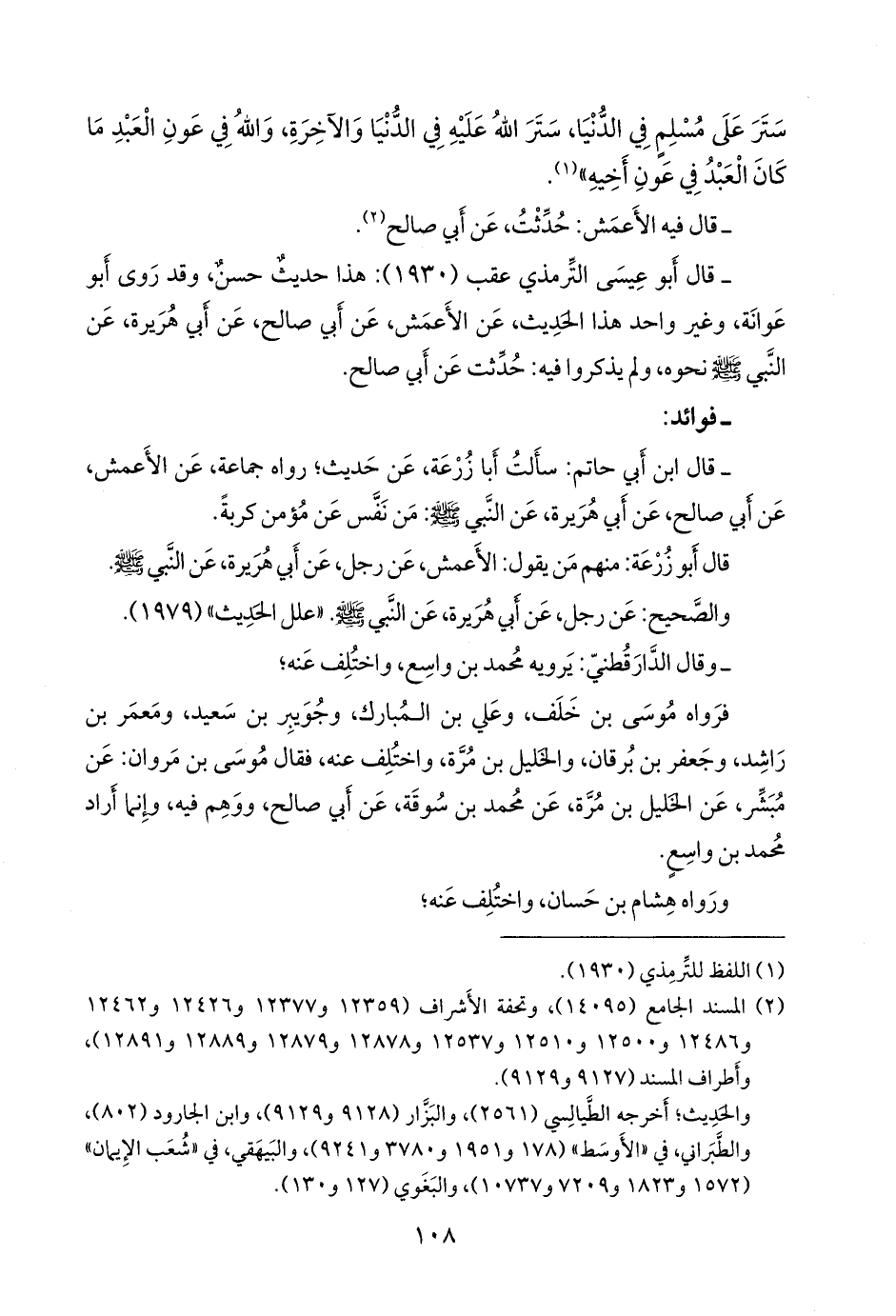 - قال ابن أبي حاتم: سألت أَبا زُرعَة، عن حديث؛ رواه جماعة، عن الأعمش، عن أبي صالح، عن أبي هريرة، عن النبي صَلى الله عَليه وسَلم: من نفس عن مؤمن كربة.