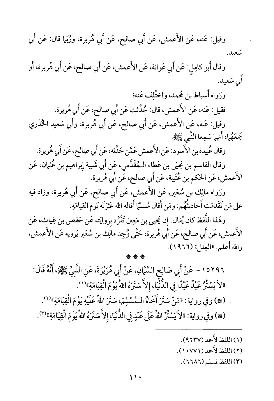 - وفي رواية: «من ستر أخاه المسلم، ستر الله عليه يوم القيامة» (¬٢).