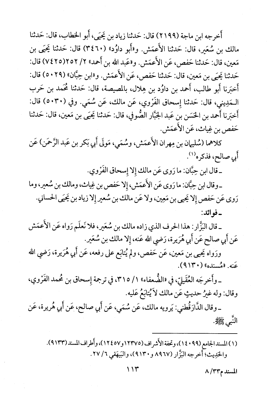 - قال البزار: هذا الحرف الذي زاده مالك بن سعير، فلا نعلم رواه عن الأعمش عن أبي صالح عن أبي هريرة، رضي الله عنه، إلا مالك بن سعير.
