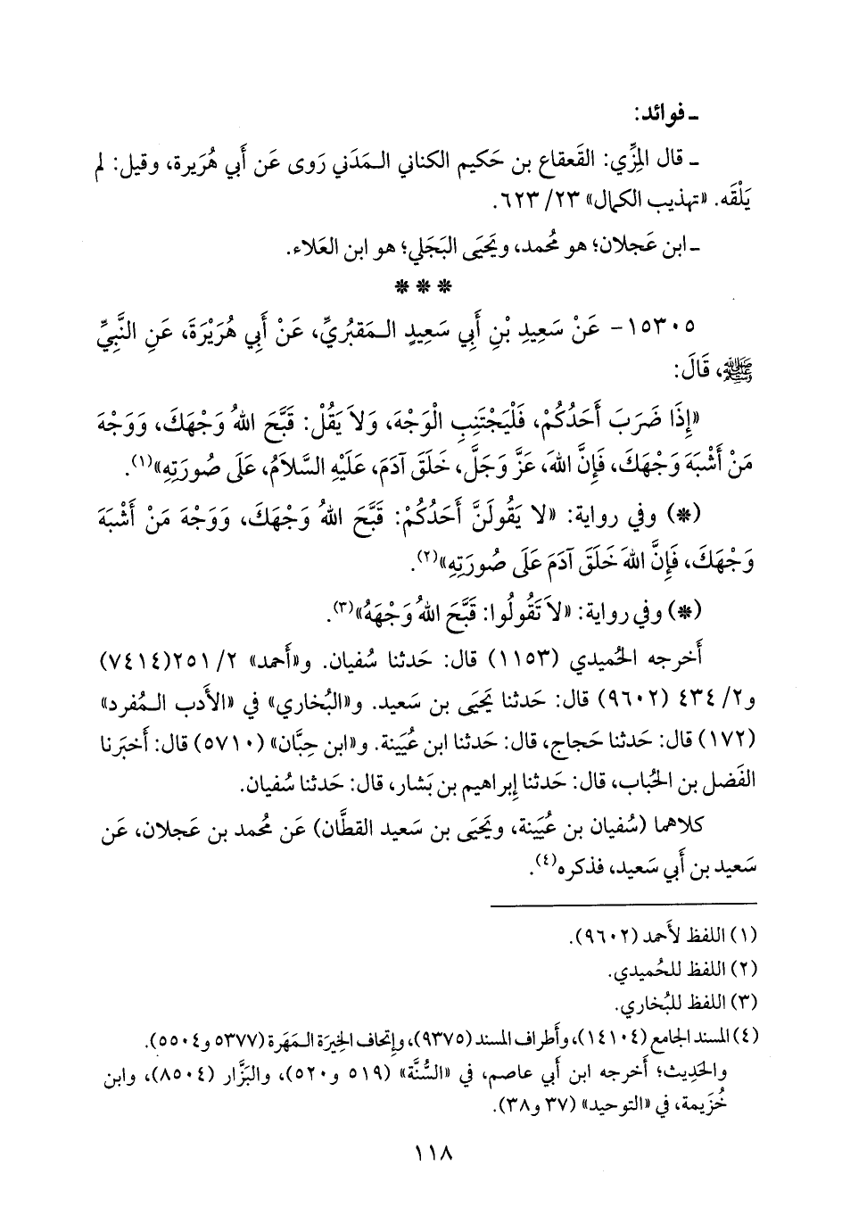 • أَخرجه البخاري في «الأدب المفرد» (١٧٣) قال: حدثنا عبد الله بن محمد، قال: حدثنا ابن عُيينة، عن ابن عَجلان، عن سعيد، عن أبي هريرة، رضي الله عنه, قال: لا تقولن: قبح الله وجهك، ووجه من أشبه وجهك، فإن الله، عز وجل، خلق آدم على صورته. «موقوف».