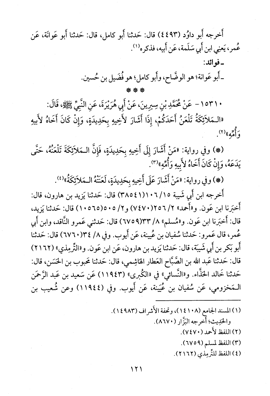 - وفي رواية: «من أشار إلى أخيه بحديدة، فإن الملائكة تلعنه، حتى يدعه، وإن كان أخاه لأبيه وأمه» (¬٢).