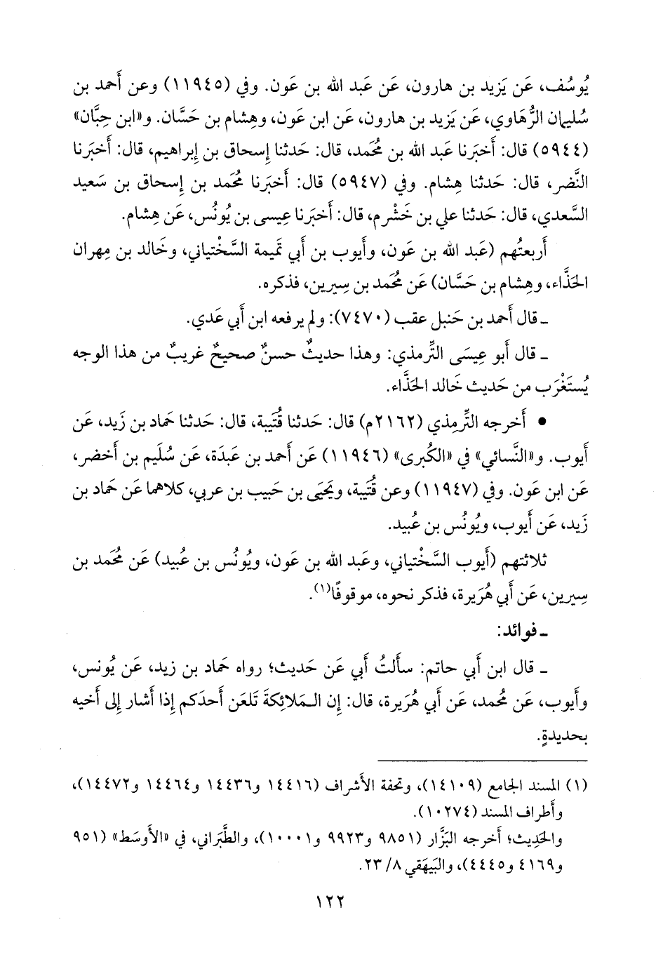 وفي (١١٩٤٥) وعن أحمد بن سليمان الرُّهاوي، عن يزيد بن هارون، عن ابن عَون، وهشام بن حسان. و «ابن حِبَّان» (٥٩٤٤) قال: أخبرنا عبد الله بن محمد، قال: حدثنا إسحاق بن إبراهيم، قال: أخبرنا النضر، قال: حدثنا هشام. وفي (٥٩٤٧) قال: أخبرنا محمد بن إسحاق بن سعيد السعدي، قال: حدثنا علي بن خشرم، قال: أخبرنا عيسى بن يونس، عن هشام.