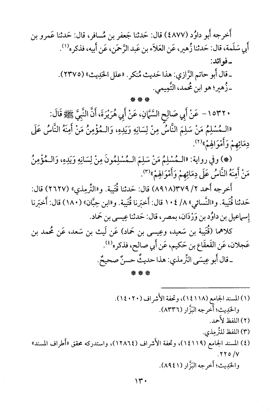 - وفي رواية: «المسلم من سلم المسلمون من لسانه ويده، والمؤمن من أمنه الناس على دمائهم وأموالهم» (¬٢).